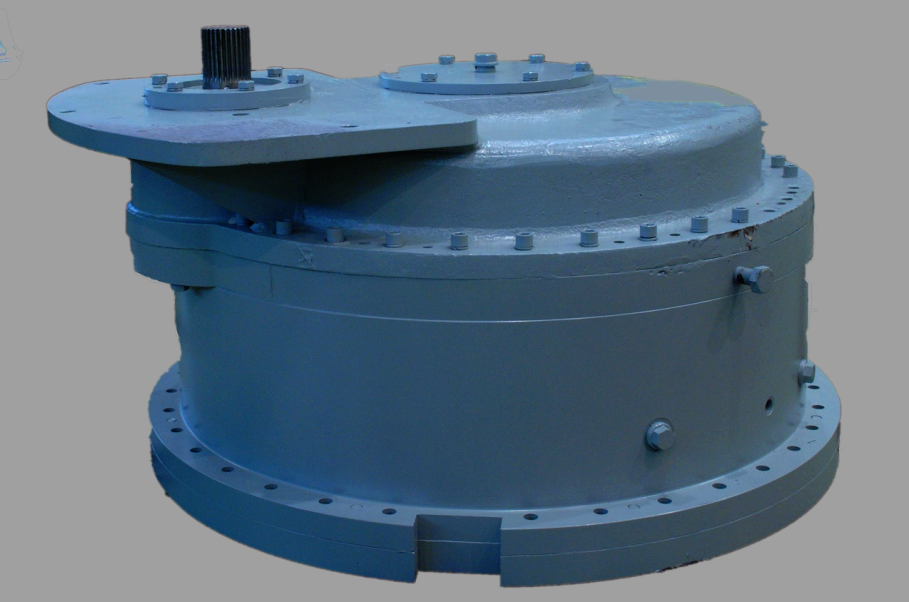 行走減速機安裝在履帶架上,由電機牽引驅(qū)動挖掘機的走行;回轉(zhuǎn)減速機安裝在回轉(zhuǎn)平臺上,為行星結(jié)構(gòu)一級減速機,電機驅(qū)動減速機,減速機輸出軸通過聯(lián)接回轉(zhuǎn)立軸齒輪與回轉(zhuǎn)大齒圈嚙合,實現(xiàn)挖掘機的回轉(zhuǎn)運動;提升減速機為挖掘機提升機構(gòu)的主傳動設(shè)備,用于驅(qū)動提升卷筒;推壓減速機位于起重臂上,減速機輸出軸聯(lián)接小齒輪與斗桿齒條嚙合,驅(qū)動齒條左往復(fù)運動,與提升機構(gòu)一起工作實現(xiàn)鏟斗挖掘作業(yè)。