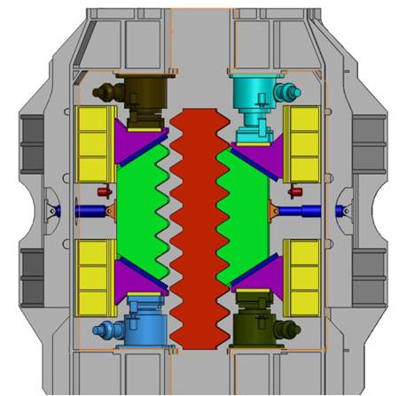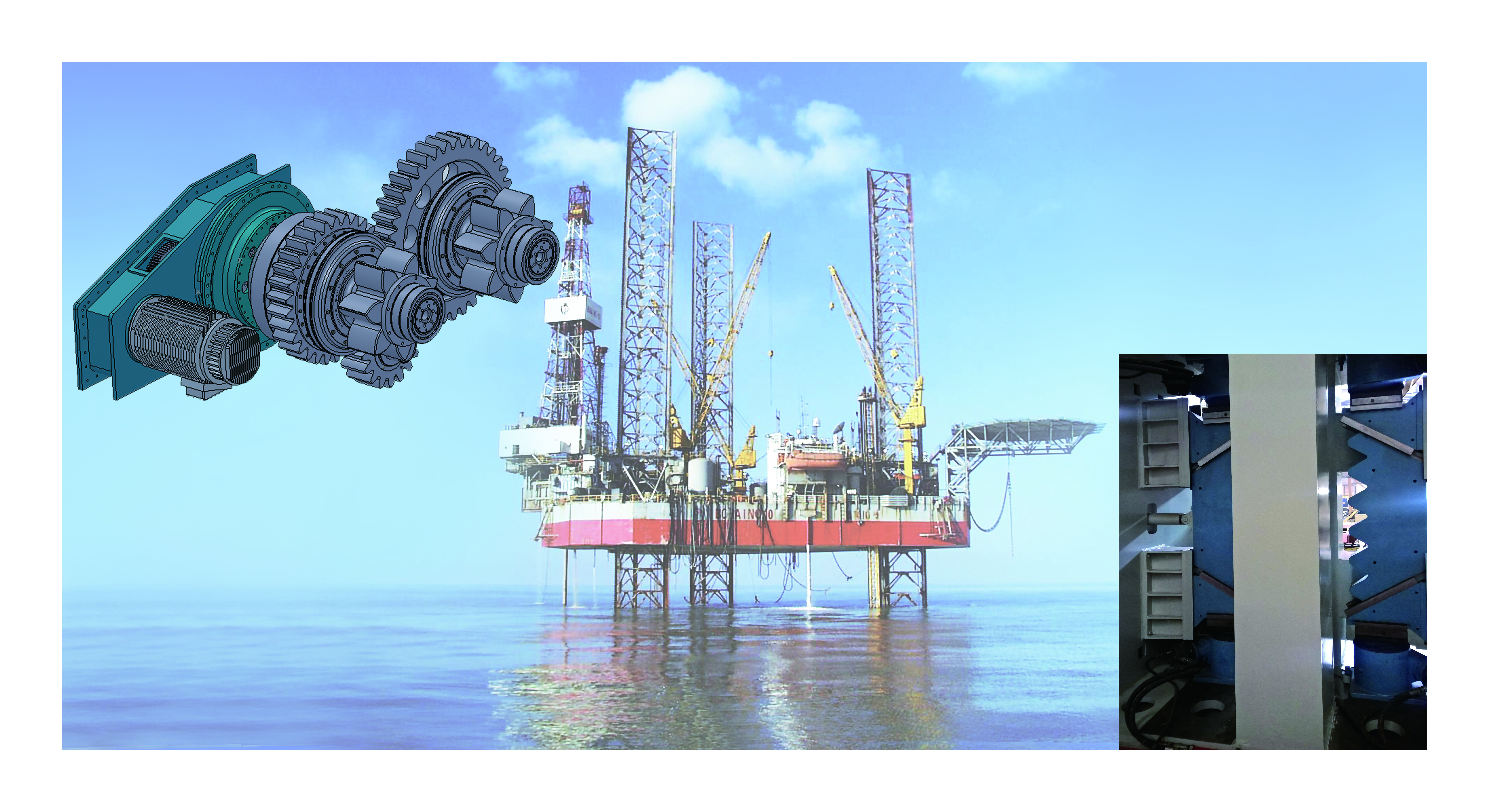 升降系統(tǒng)采用齒輪齒條嚙合原理實現(xiàn)平臺或樁腿的升降操作。安裝在船體的固樁架上,可以采用電機(jī)和液壓馬達(dá)驅(qū)動,每一升降單元有爬升齒輪、減速機(jī)、電機(jī)/液壓馬達(dá)和具有自動保護(hù)功能的電磁剎車組成。配有電機(jī)控制中心、中央控制臺和樁邊控制柜;鎖緊系統(tǒng)由液壓驅(qū)動,由螺桿升降裝置,鎖緊齒塊,楔塊,油缸和分配器,泵站,樁邊控制柜等組成。