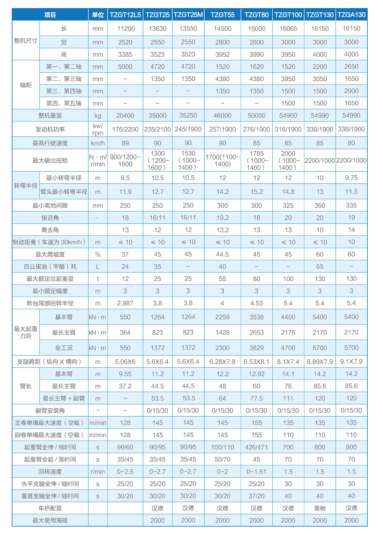 TZGT系列汽車(chē)起重機(jī)和TZGA系列全地面起重機(jī),產(chǎn)品涵蓋12-130t,整機(jī)性能行業(yè)領(lǐng)先
