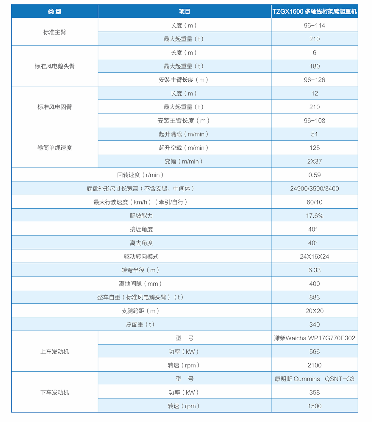 TZGX1600多軸線桁架臂起重機針對風(fēng)機安裝特點,上車采用快拆式桁架臂起重機結(jié)構(gòu),下車采用可自行、可牽引多軸線底盤,整機最大部件運輸寬度小于3.5m,起重能力超強,轉(zhuǎn)場高效便捷,可滿足百米級4.XMW及以上風(fēng)機吊裝。