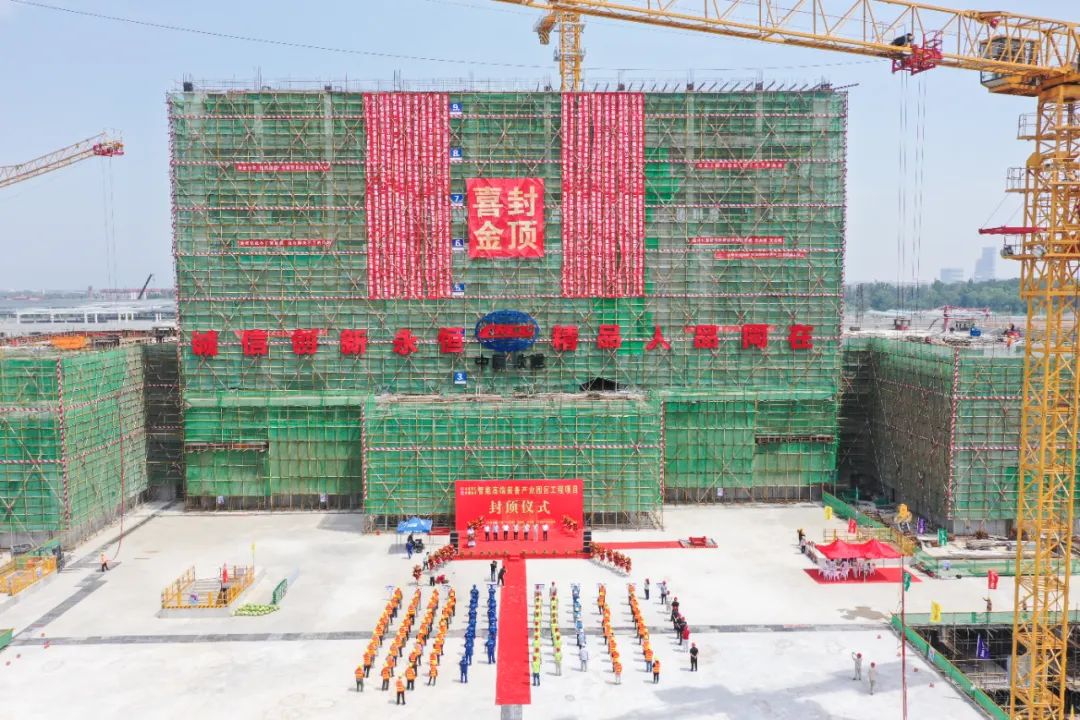 高高矗立,與藍(lán)天白云交相輝映,紅布金字的字樣顯得格外矚目。經(jīng)歷9個(gè)月的緊張高效施工,運(yùn)營(yíng)中心主體結(jié)構(gòu)封頂,標(biāo)志著新園區(qū)基礎(chǔ)設(shè)施及廠房配套項(xiàng)目建設(shè)取得了重要的階段性勝利,為后續(xù)施工奠定了堅(jiān)實(shí)的基礎(chǔ)。