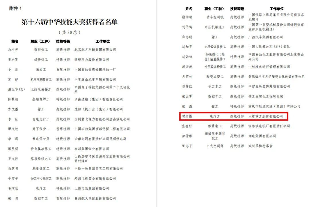 近日,第十六屆“中華技能大獎”和“全國技術能手”名單出爐!全國僅30名中華技能大獎獲得者,太重集團高級技師樊志勤榜上有名,也是獲此殊榮的第一位太重人!衷心祝賀喜獲殊榮!