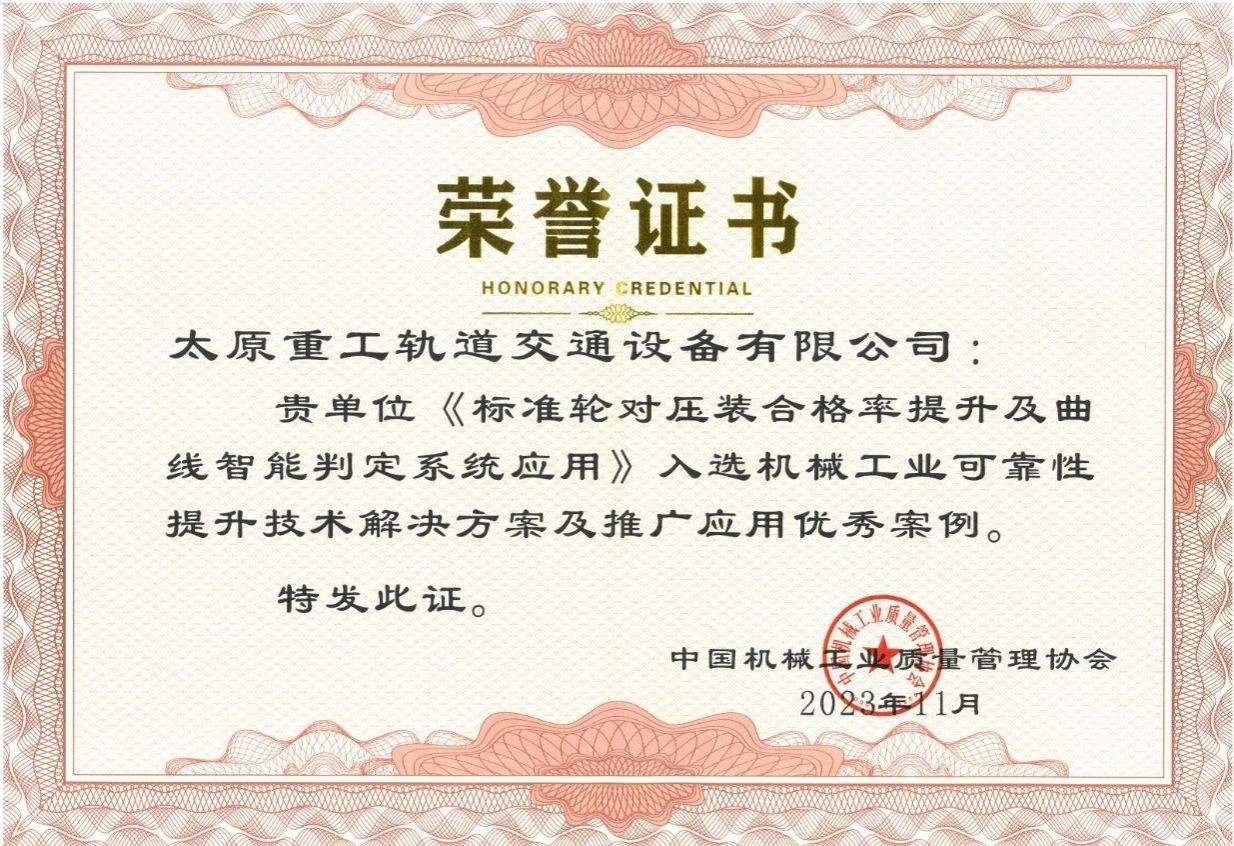 近日,在第八屆全國機(jī)械工業(yè)可靠性技術(shù)應(yīng)用交流大會(huì)上,太重軌道公司《標(biāo)準(zhǔn)輪對壓裝合格率提升及曲線智能判定系統(tǒng)應(yīng)用》項(xiàng)目榮獲機(jī)械工業(yè)可靠性提升技術(shù)解決方案及推廣應(yīng)用優(yōu)秀案例,是山西省唯一入選該獎(jiǎng)項(xiàng)的企業(yè)。