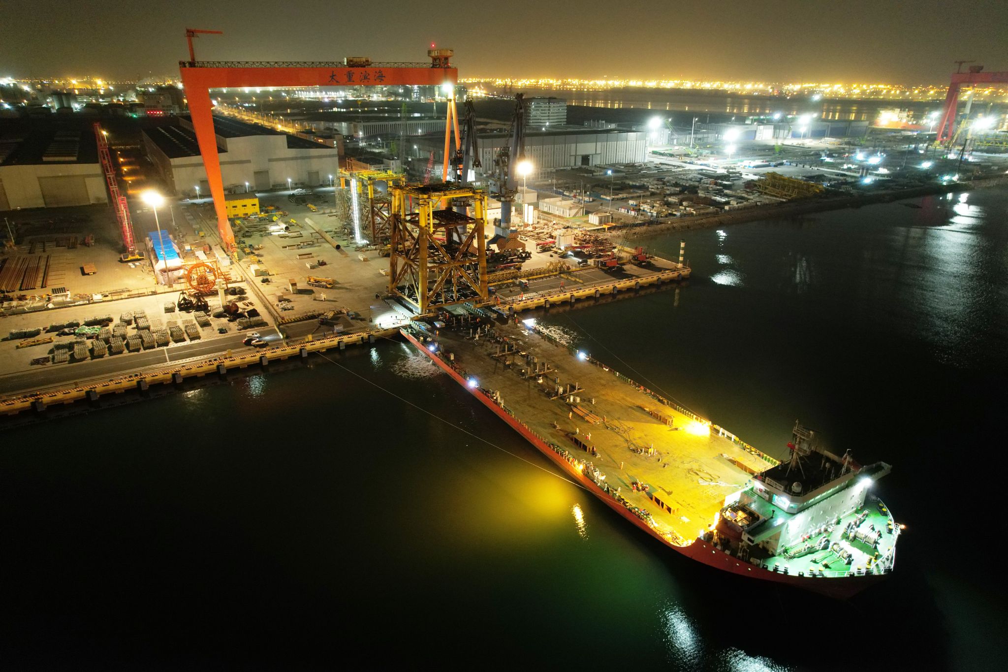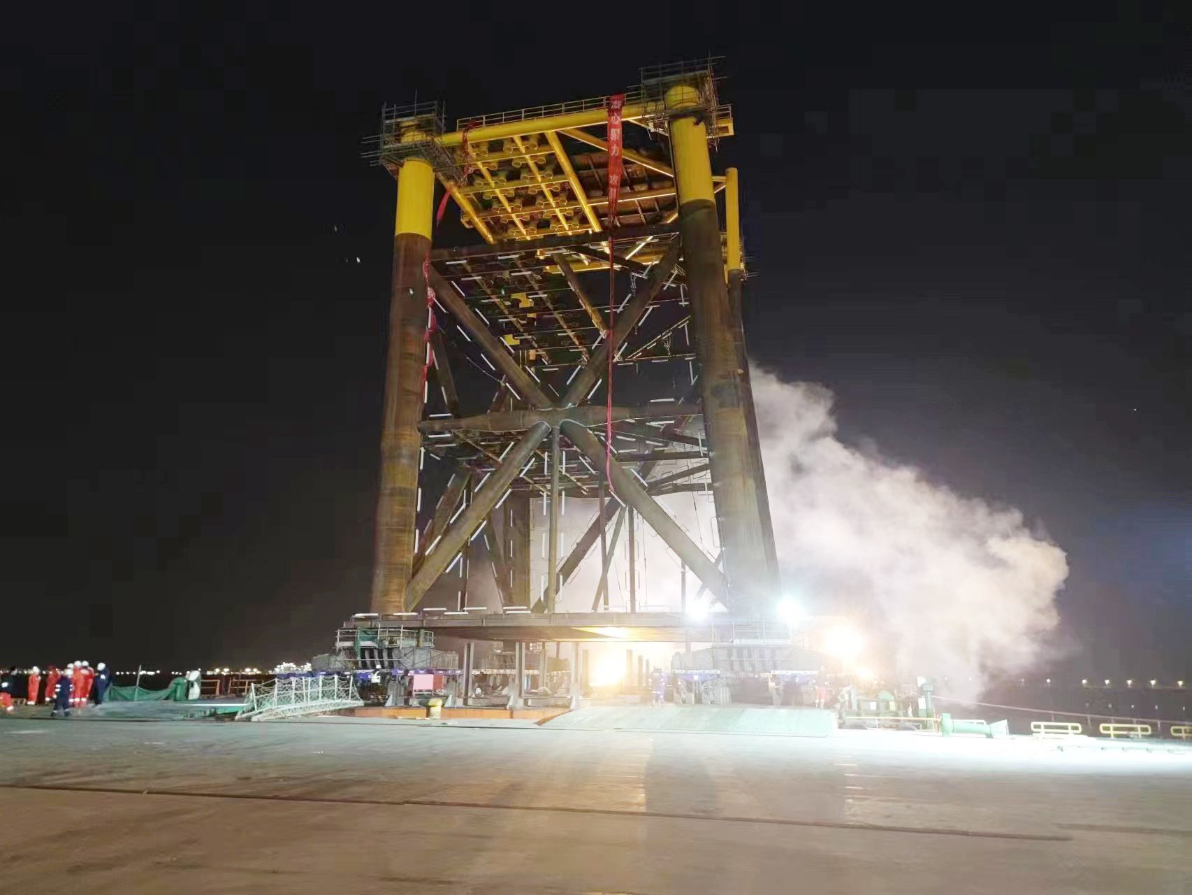 近日,太重濱海公司制造的旅大5-2 N WHPB導(dǎo)管架,在4列藍色模塊小車的承載下穩(wěn)穩(wěn)地登上駁船,以乘風(fēng)破浪之姿,向深海駛?cè)ァ?/span>