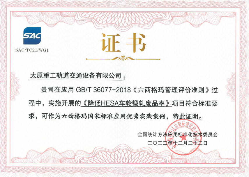 近日,由太重軌道公司完成的《降低HESA車輪鍛軋廢品率》管理項目,榮獲六西格瑪國家標準應(yīng)用優(yōu)秀實踐案例。此獎項由全國統(tǒng)計方法應(yīng)用標準化技術(shù)委員會授予,并在精益六西格瑪方法及其應(yīng)用工作組2023年年會暨精益六西格瑪管理國家標準應(yīng)用案例經(jīng)驗交流會上,對太重進行了表彰。