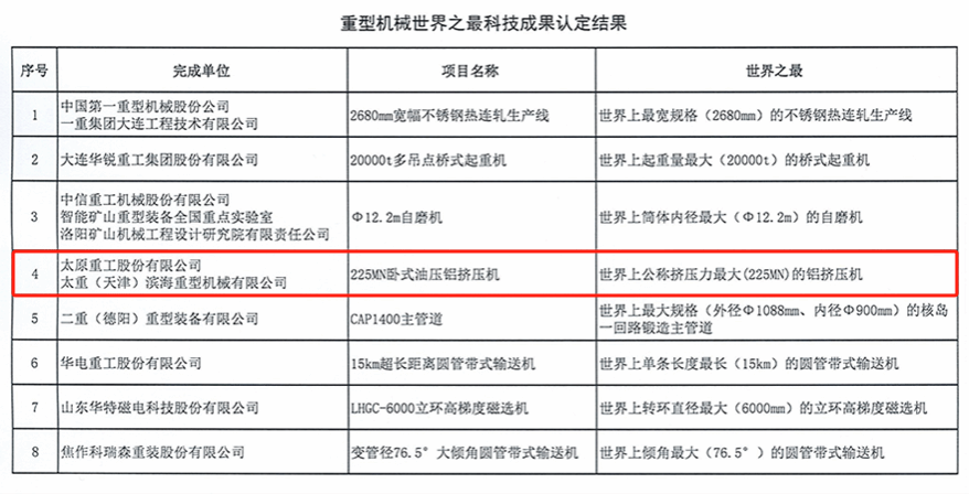 近日,中國(guó)重型機(jī)械工業(yè)協(xié)會(huì)組織認(rèn)定的“重型機(jī)械世界之最科技成果”名單出爐,由太重自主設(shè)計(jì)研發(fā)的“225MN臥式鋁擠壓機(jī)”成功入選,再次展現(xiàn)了太重在鍛壓設(shè)備領(lǐng)域無(wú)可爭(zhēng)議的領(lǐng)先地位。