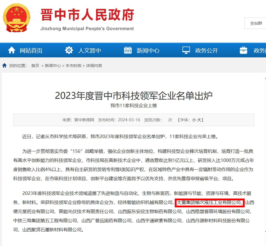 近日,2023年度晉中市科技領(lǐng)軍企業(yè)名單公布,太重榆液憑借卓越的技術(shù)創(chuàng)新、優(yōu)秀的市場(chǎng)表現(xiàn)以及對(duì)地方經(jīng)濟(jì)的突出貢獻(xiàn)光榮上榜,進(jìn)一步叫響了太重品牌,提升了公司行業(yè)影響力。
