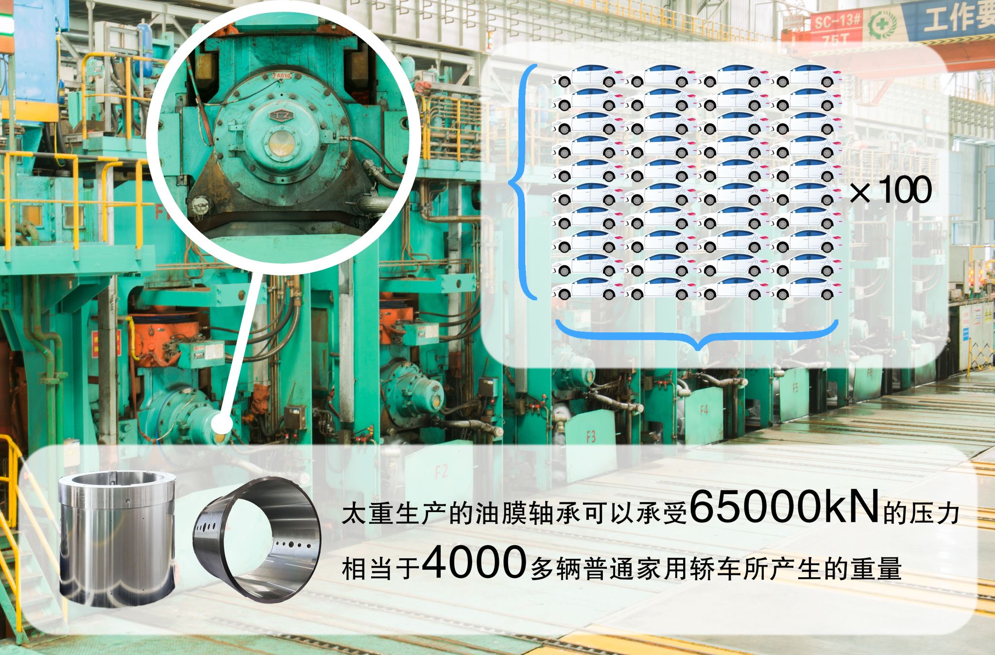 油膜軸承屬于全液體潤滑軸承的范疇,相比其他液體滑動軸承,其所處工況處于低速重載狀態(tài),作為現(xiàn)代軋機的心臟,太重生產(chǎn)的油膜軸承單個就可以承受65000kN(6700t)的壓力,相當(dāng)于4000多輛普通家用轎車所產(chǎn)生的重量。