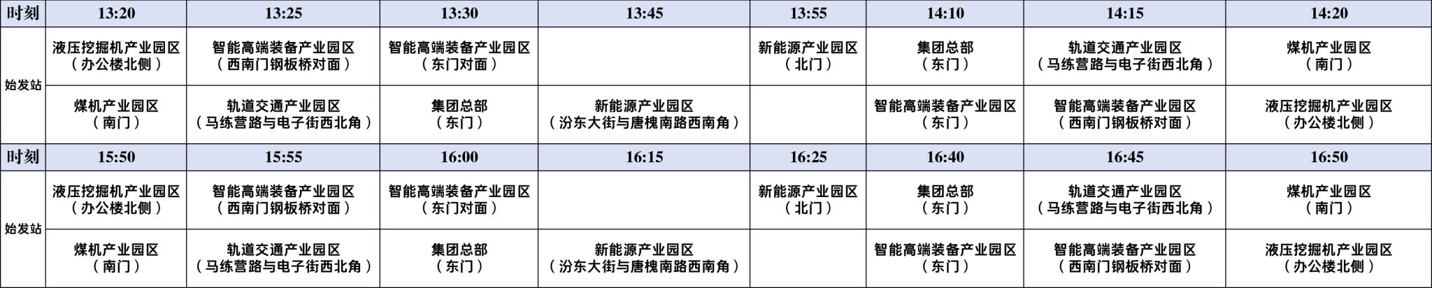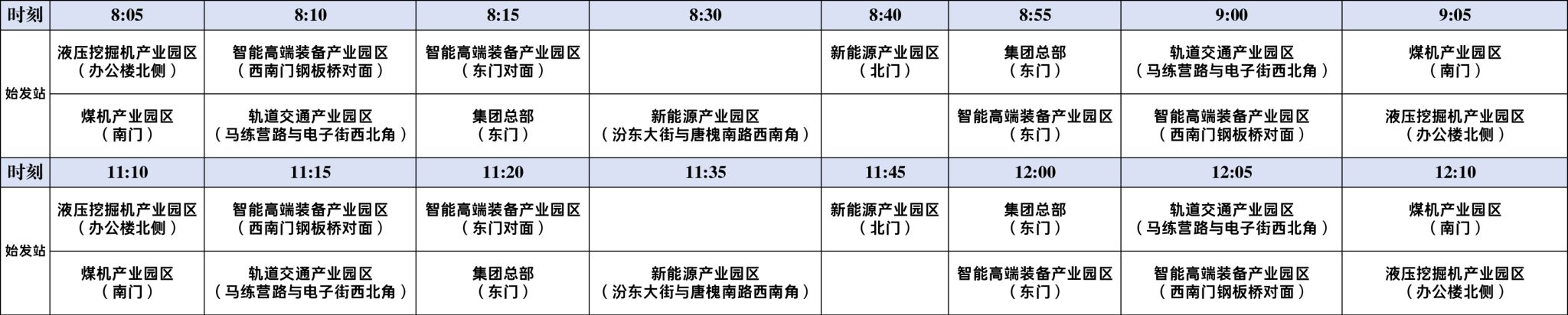 每日7:00、8:00、15:00、16:00,由太重萬(wàn)柏林園區(qū)玉河街前進(jìn)路站(醫(yī)院北門)發(fā)車→前進(jìn)路西礦街站(芙蓉外賣)→虎峪河千峰南路站→南錄樹(shù)站(尚賢路口)→尚賢路文源路口站(工程機(jī)械東二門)→太重智能高端裝備產(chǎn)業(yè)園區(qū)東門。