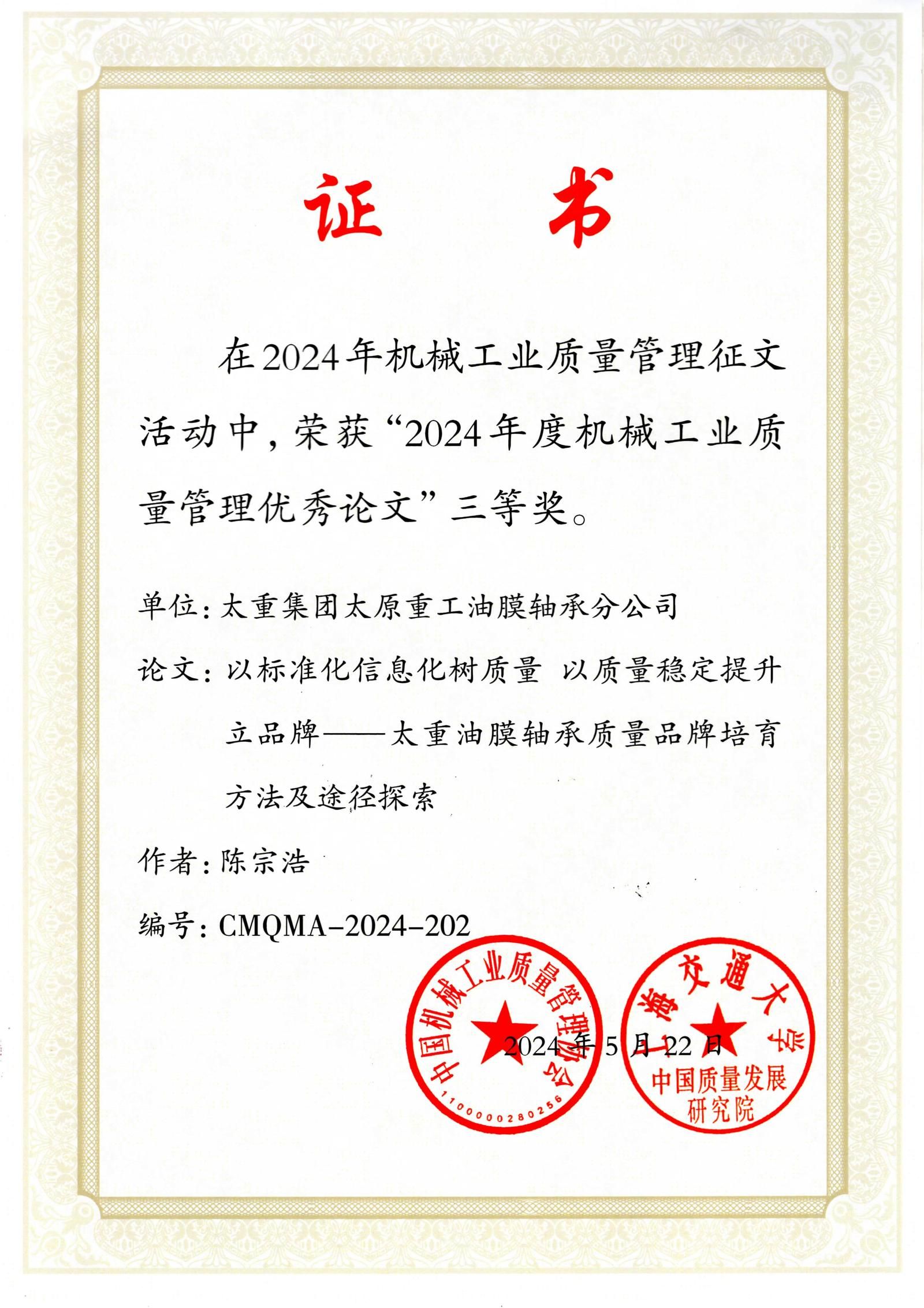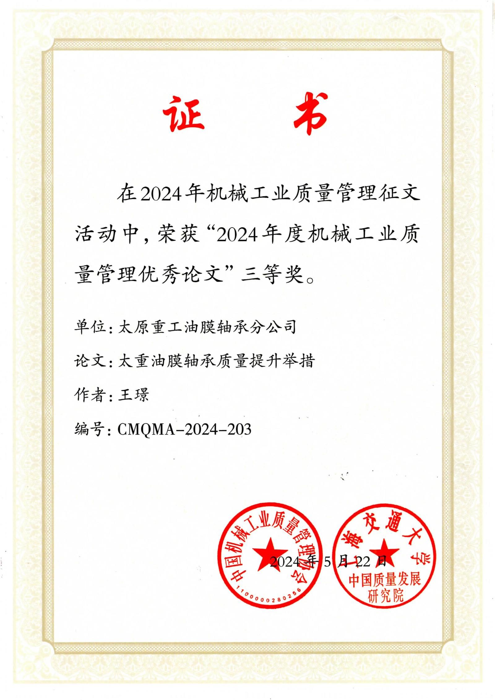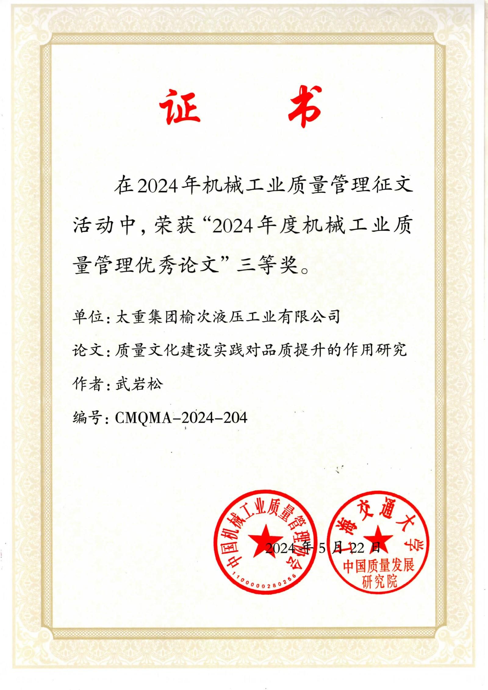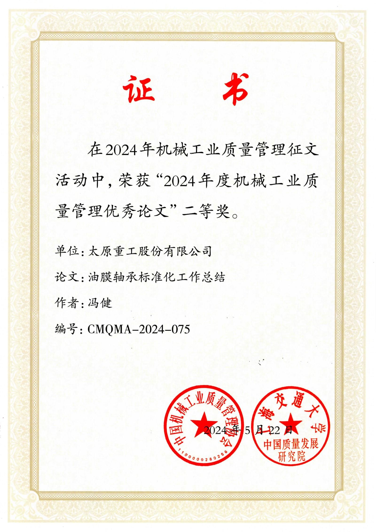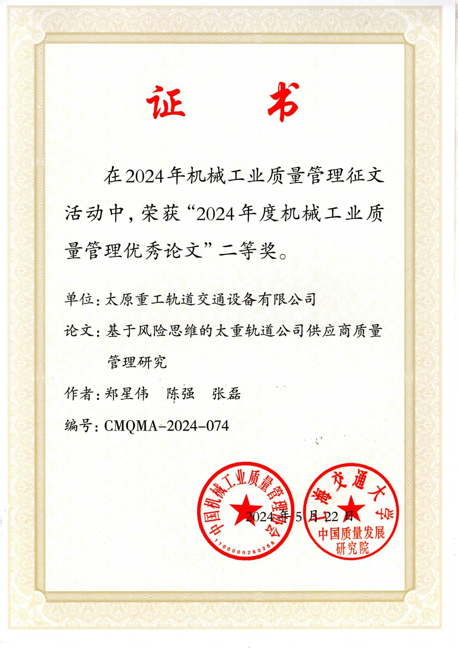 本次優(yōu)秀論文評選由業(yè)內知名專家組成評審團,從創(chuàng)新性、實用性、影響力等多個維度進行綜合評價,旨在挖掘并推廣機械工業(yè)質量管理領域的前沿理念和成功經驗。該獎項申報門檻高、評審標準嚴,代表了行業(yè)領先水平。公司在此次評選中滿載而歸、碩果累累,是太重雄厚質量管理能力的有力見證,也折射出太重質量工作者潛心鉆研、追求卓越的創(chuàng)新精神。