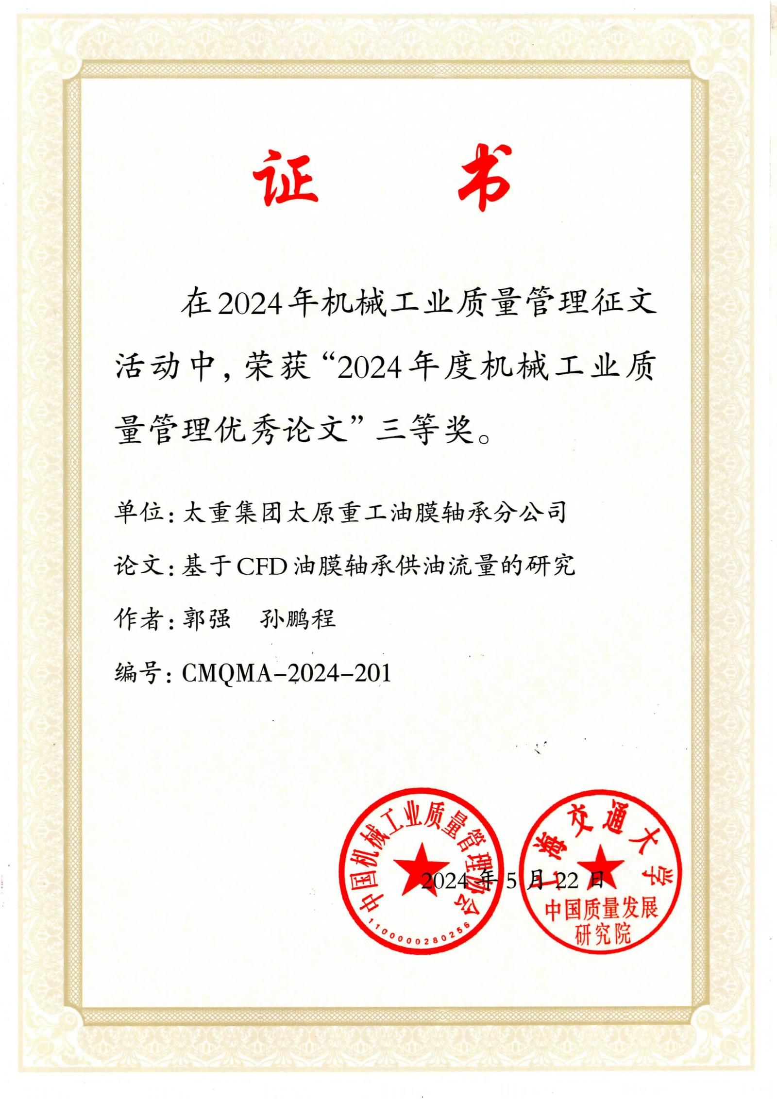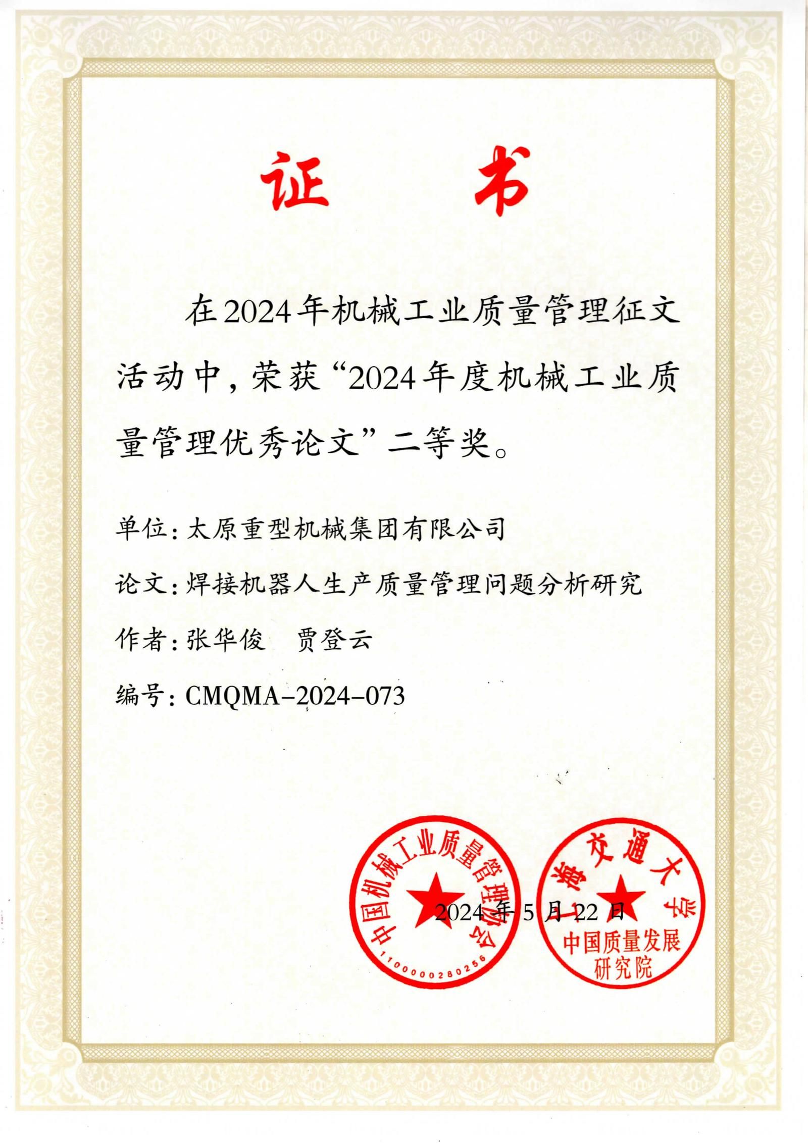 近日,中國機械工業(yè)質量管理協會與上海交通大學中國質量發(fā)展研究院聯合發(fā)布了“關于表彰機械工業(yè)質量管理優(yōu)秀論文的決定”。在這次備受關注的評選中,太重集團憑借卓越的質量管理研究與實踐成果,榮獲3項二等獎和4項三等獎。