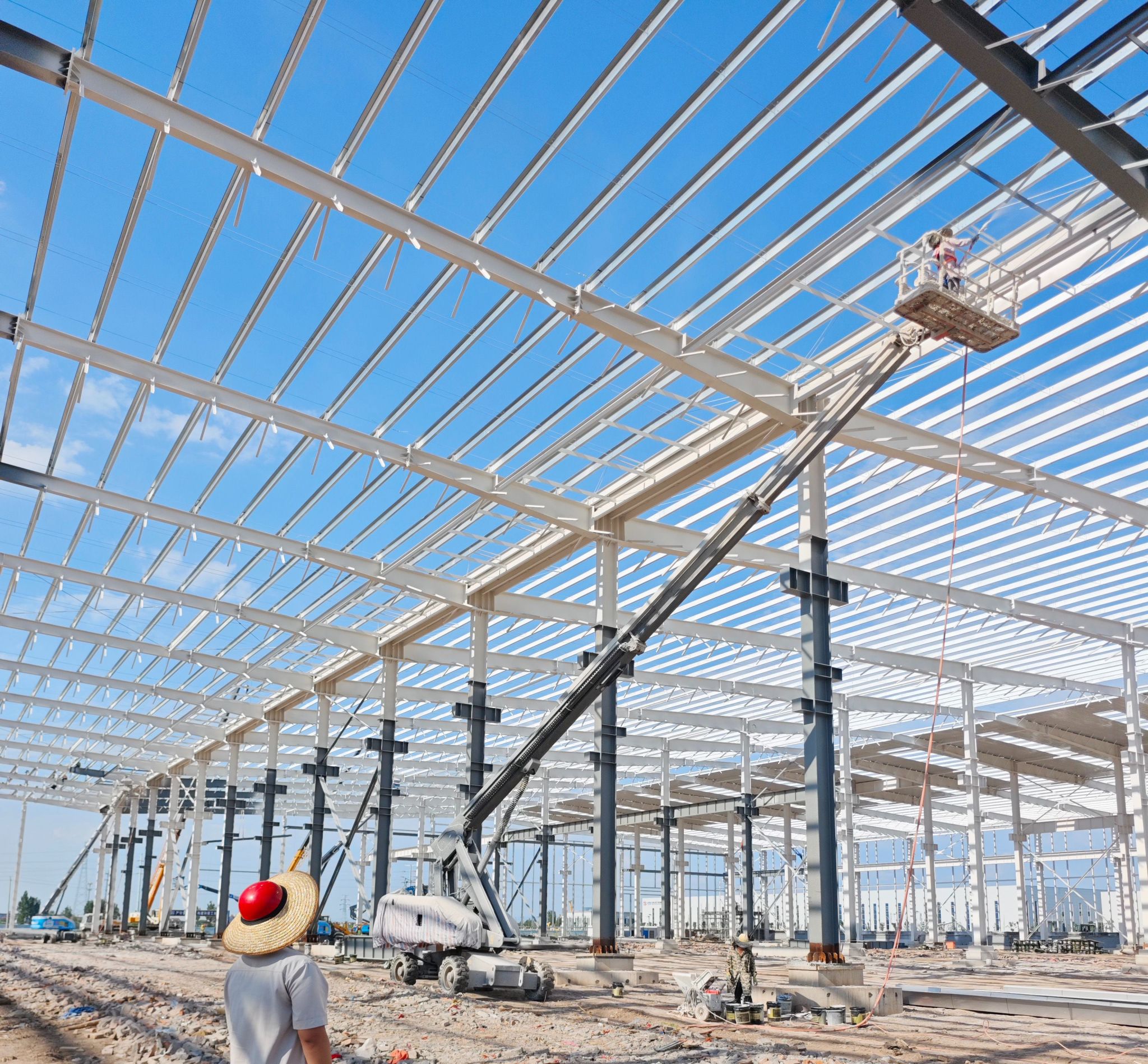 “從鋼柱首吊以來,我們按照目標節(jié)點倒排工期,精細化組織、超常規(guī)安排,正在按照‘兩個一百天’項目建設節(jié)點全力沖刺。”現(xiàn)場負責人王永斌干勁滿滿地說道。施工團隊根據(jù)工程建設情況精細策劃,對大型機械、吊索吊具等進行逐項驗收、統(tǒng)一管理,確保吊裝施工安全有序。為確保園區(qū)建設繼續(xù)快速推進,項目組還同步建設配電室、空壓站和綜合站房,全力以赴推動項目建設提速增效。