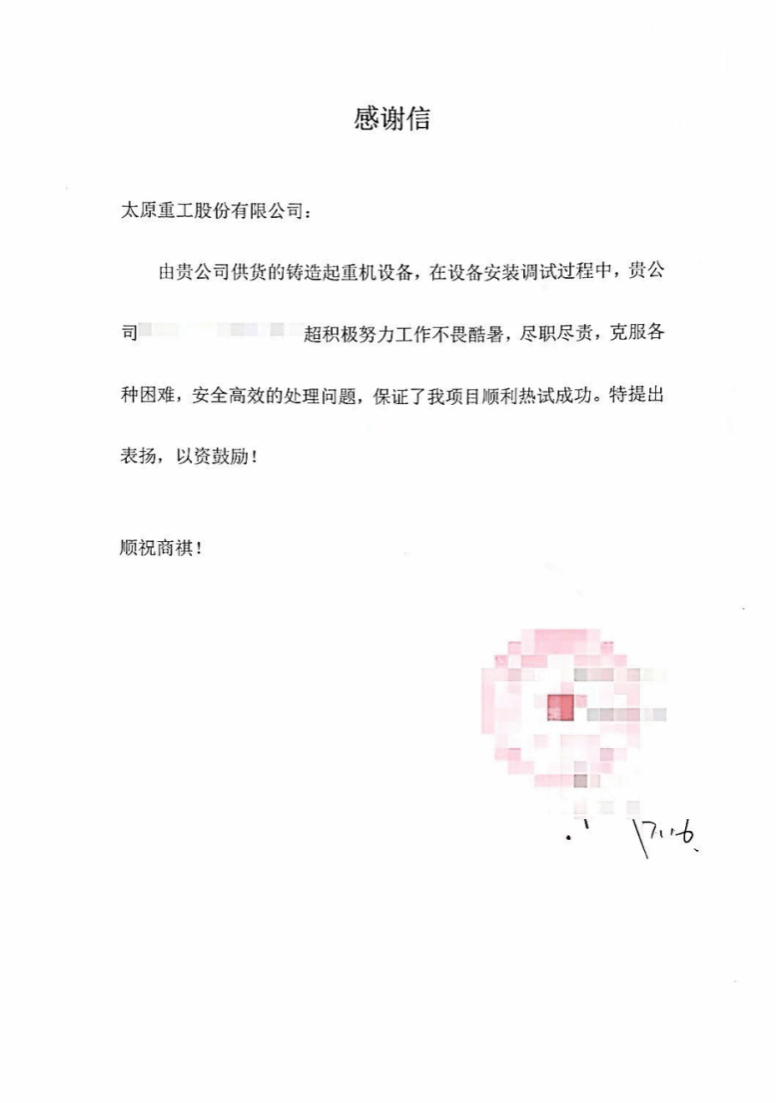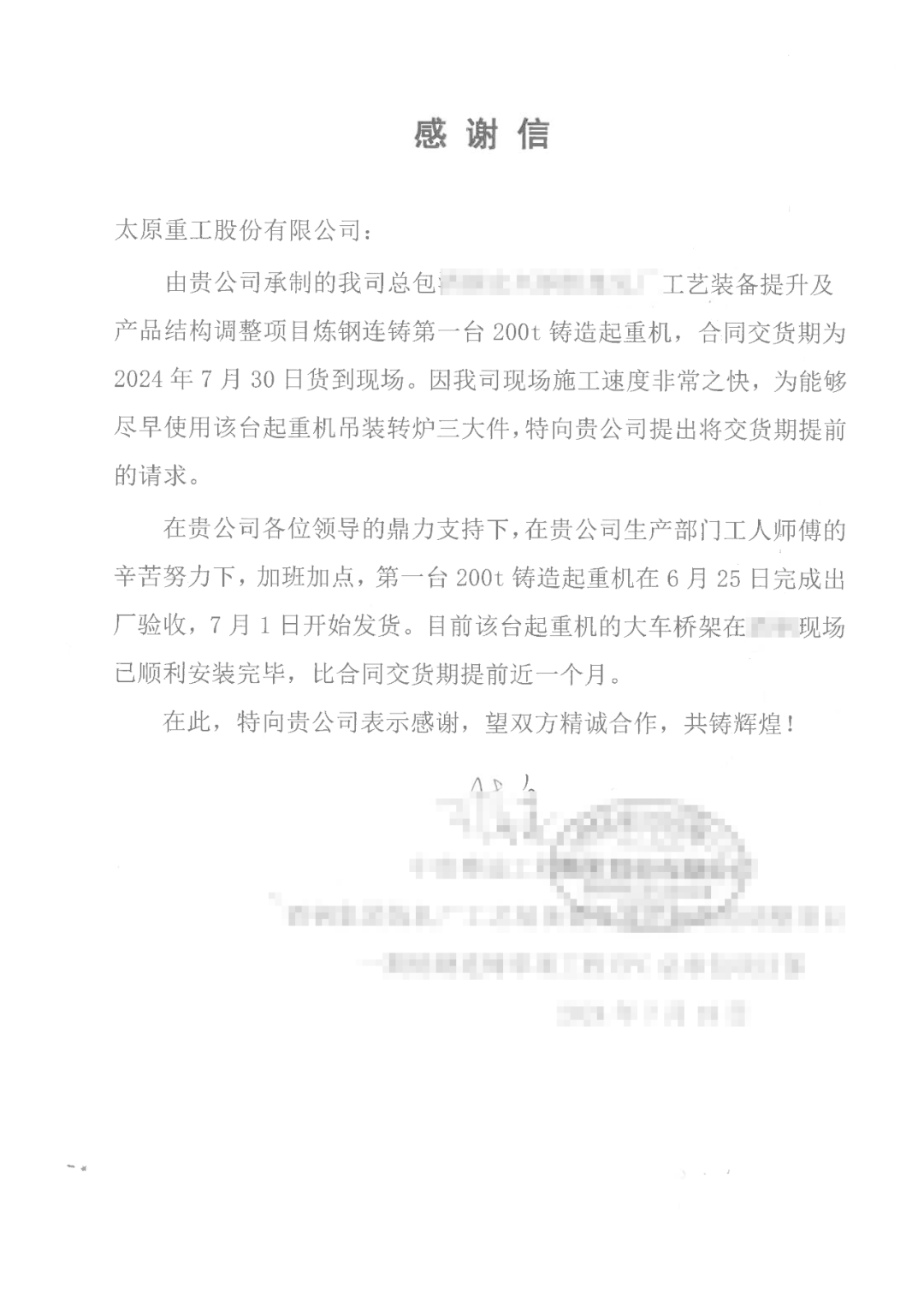 想用戶之所想,急用戶之所急。今年年初,公司與用戶首次合作便成功簽訂多個(gè)起重設(shè)備訂單。鑒于自身工程進(jìn)度需要,用戶向太重提出提前交付一臺(tái)200噸鑄造起重機(jī)的請(qǐng)求。時(shí)間緊、任務(wù)重、質(zhì)量要求高,面對(duì)“用戶之所急”,公司積極響應(yīng),及時(shí)協(xié)調(diào)技術(shù)和生產(chǎn)部門(mén),最終比合同交貨期提前近一個(gè)月交付設(shè)備,確保了用戶工程項(xiàng)目順利投產(chǎn)。“望雙方精誠(chéng)合作,共鑄輝煌!”無(wú)疑是對(duì)太重一諾千金的高度贊揚(yáng)。