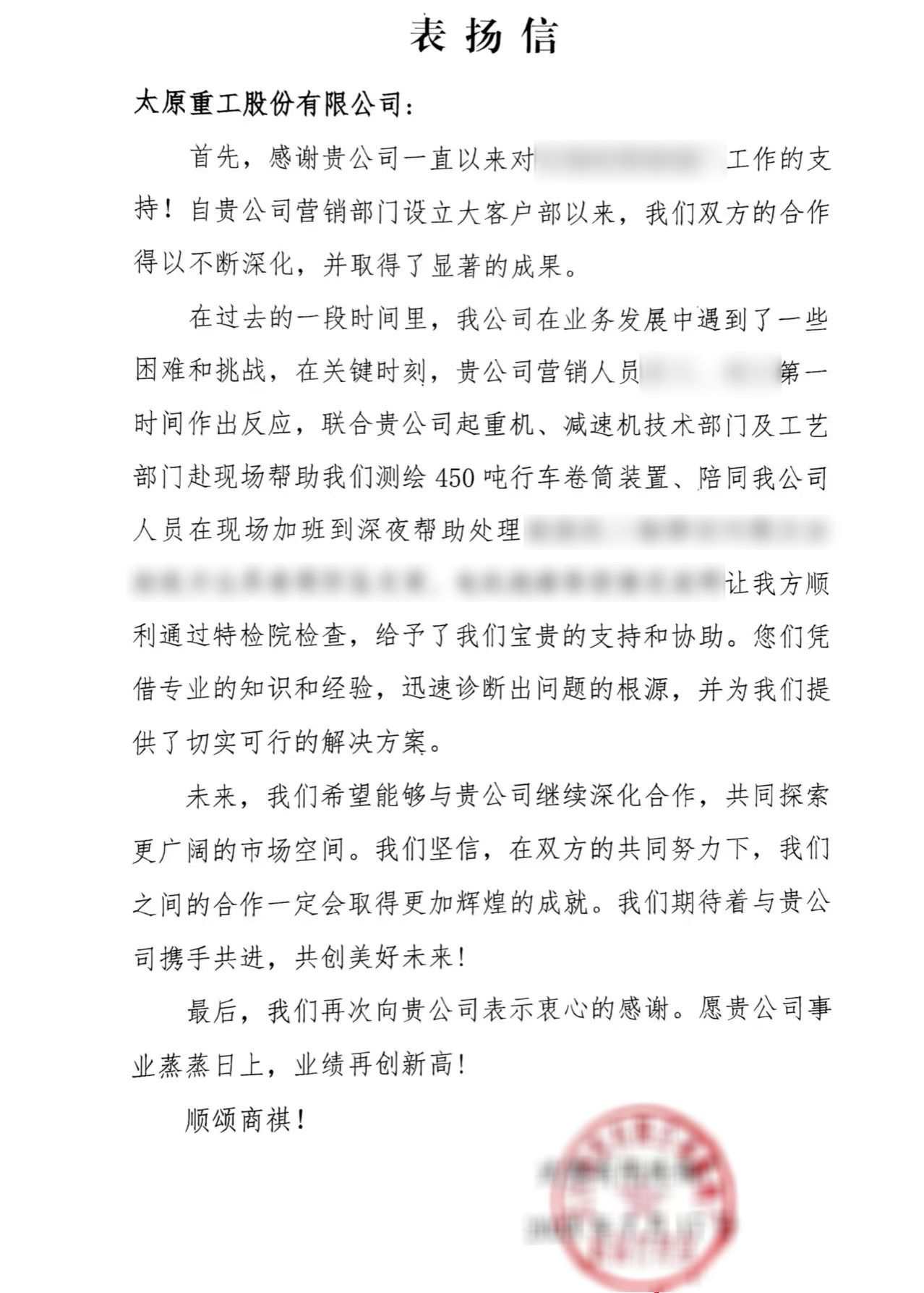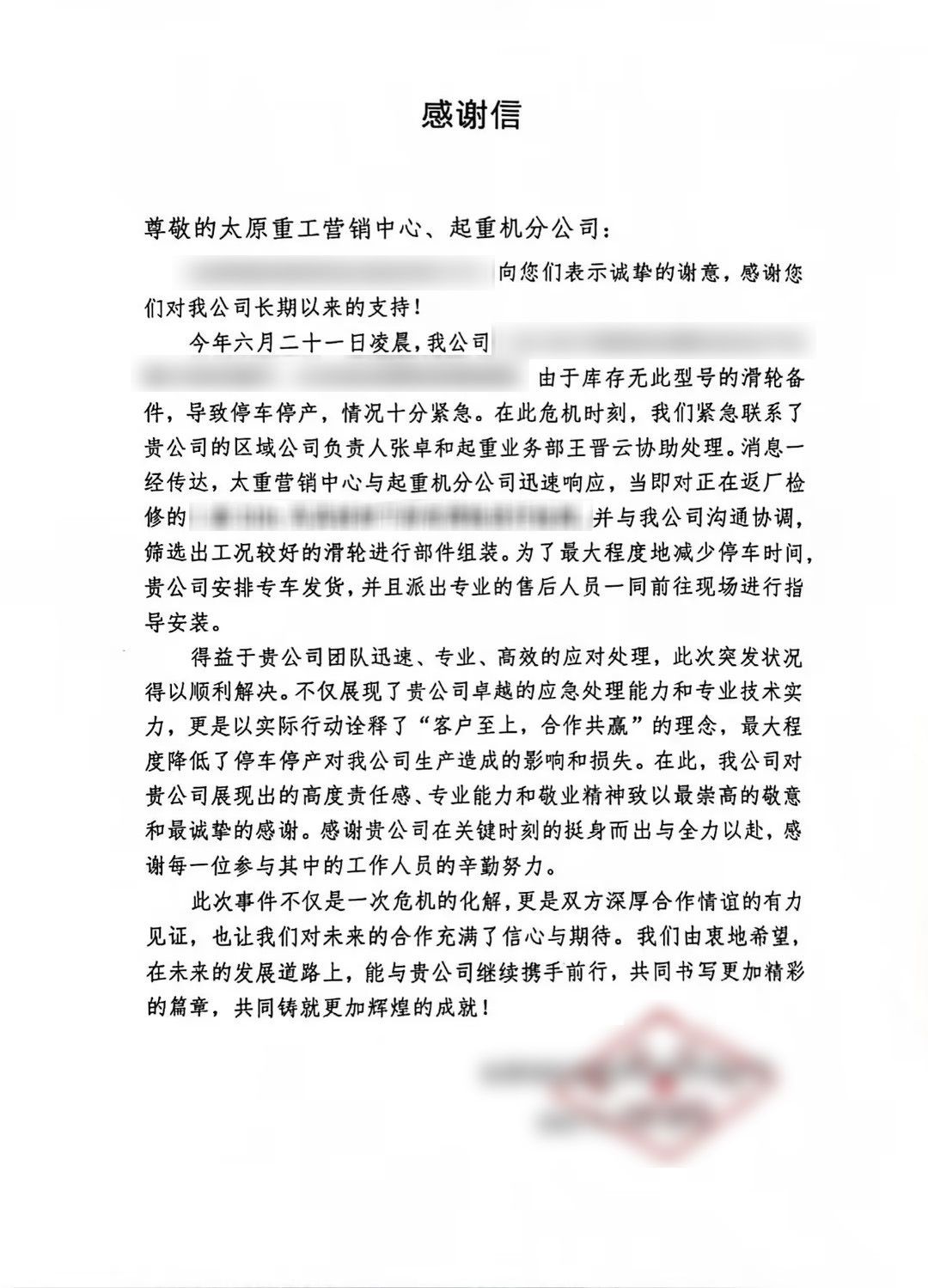 在用戶備件出現(xiàn)問(wèn)題、設(shè)備檢修、通關(guān)特檢等關(guān)鍵時(shí)刻,太重總是第一時(shí)間伸出援手,憑借專業(yè)知識(shí)和經(jīng)驗(yàn),為用戶提供切實(shí)可行的解決方案,贏得用戶的認(rèn)可和感激。相互成就、共贏未來(lái),太重與用戶一直是并肩的戰(zhàn)友!