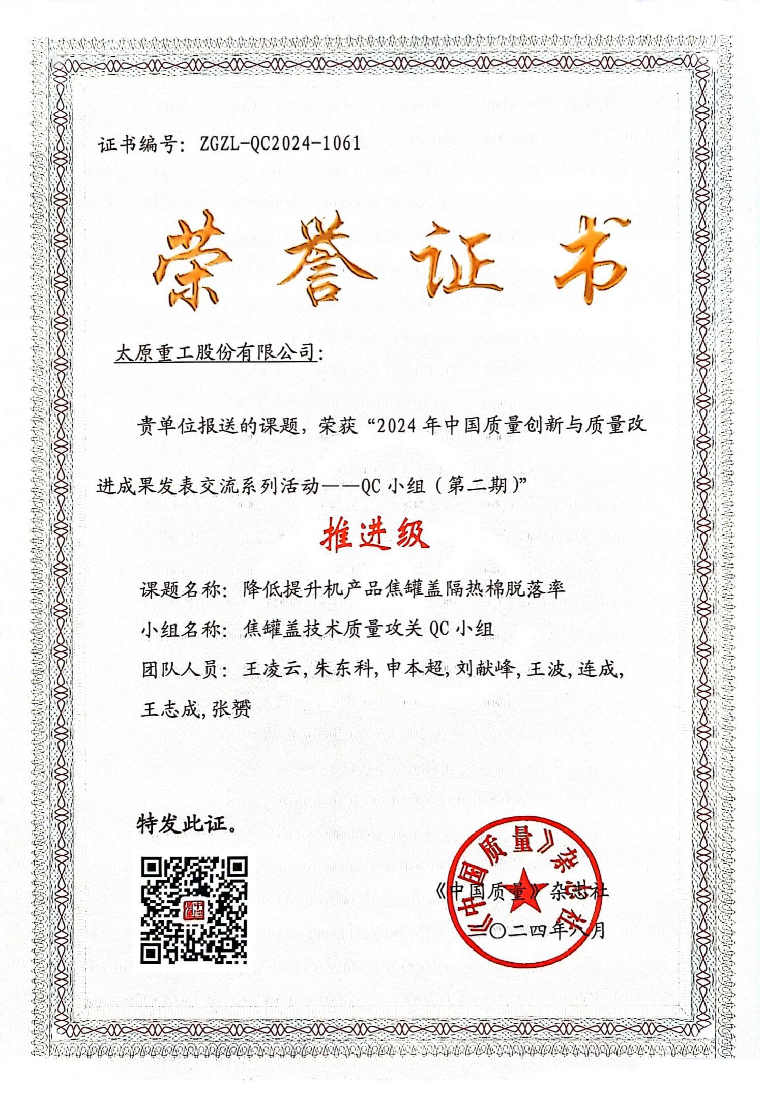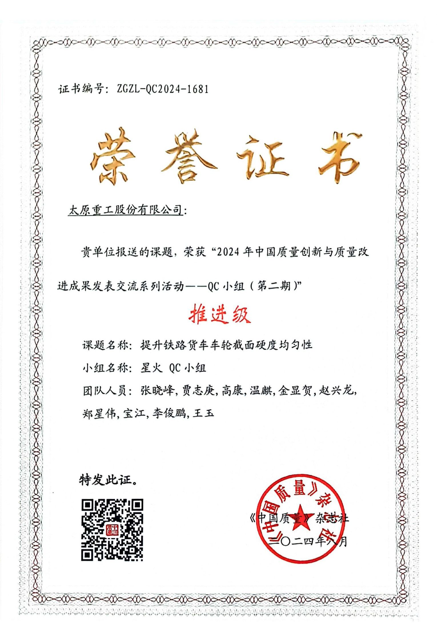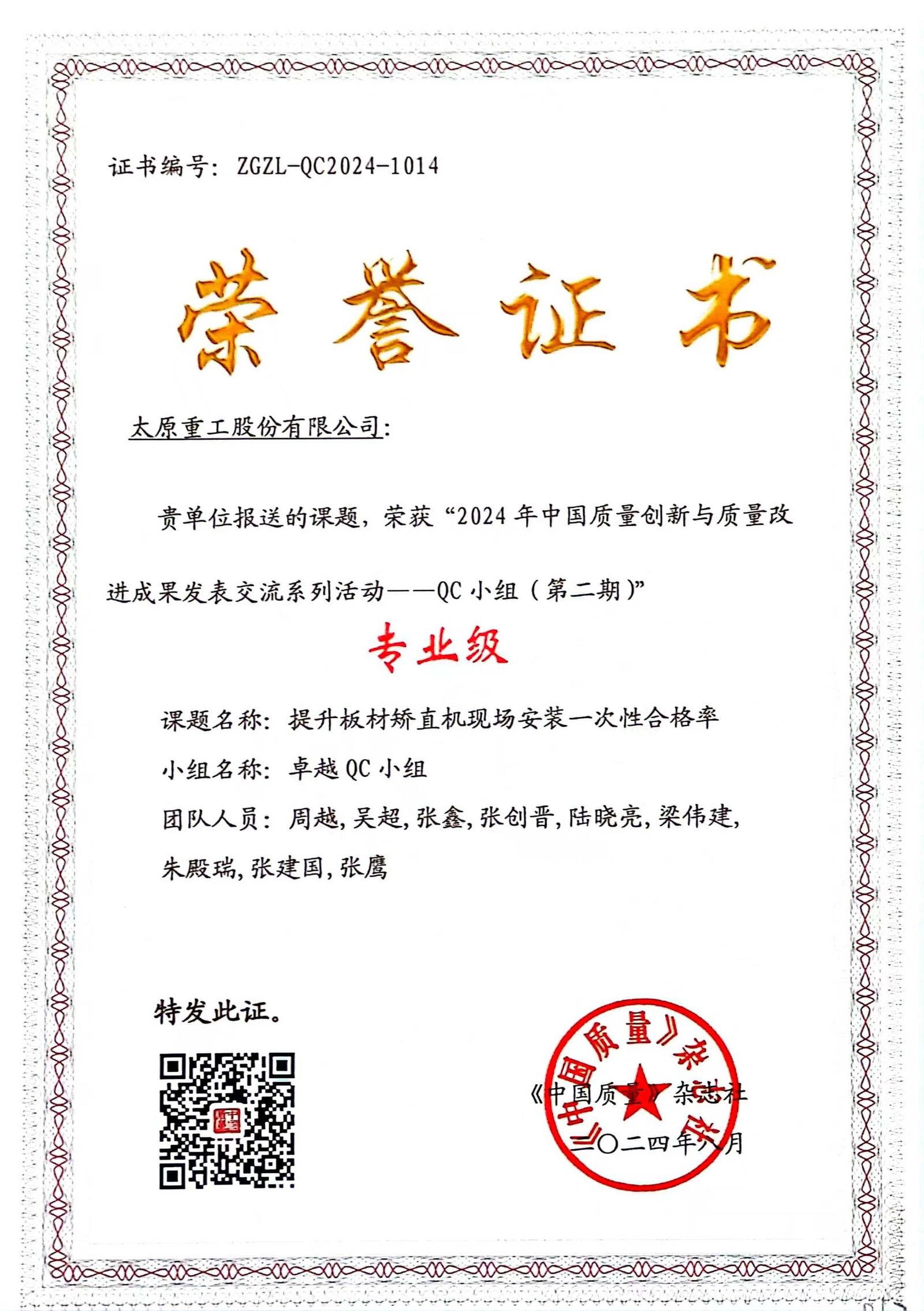 成績肯定過去,未來任重道遠。公司將以本次獲獎為契機,再接再厲推動質(zhì)量創(chuàng)新,依托先進質(zhì)量工具和信息系統(tǒng),持續(xù)推進全過程質(zhì)量管控,塑造追求卓越的質(zhì)量管理體系,全力打造太重標準、太重質(zhì)量、太重品牌,為加快培育和發(fā)展新質(zhì)生產(chǎn)力、推進新型工業(yè)化貢獻更多“太重精品”。