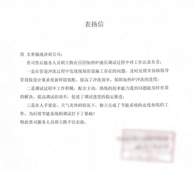 一封表揚(yáng)信,對(duì)公司售后服務(wù)人員專業(yè)的技術(shù)、敬業(yè)的精神予以高度贊揚(yáng)。為用戶交付設(shè)備后,安裝調(diào)試工作時(shí)間緊、任務(wù)重,公司立即派出經(jīng)驗(yàn)豐富的售后專員奔赴用戶現(xiàn)場,扎根作業(yè)一線、克服高溫酷暑,幫助用戶完成節(jié)能系統(tǒng)安裝以及電控的布線走線工作,與此同時(shí),還對(duì)用戶的管路沖洗方案進(jìn)行優(yōu)化,為用戶提供切實(shí)可行的解決方案,提出專業(yè)建議,最大程度保障了用戶利益。