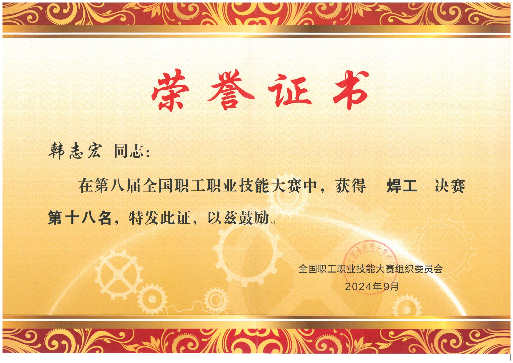 全國(guó)職工職業(yè)技能大賽焊工第十八名