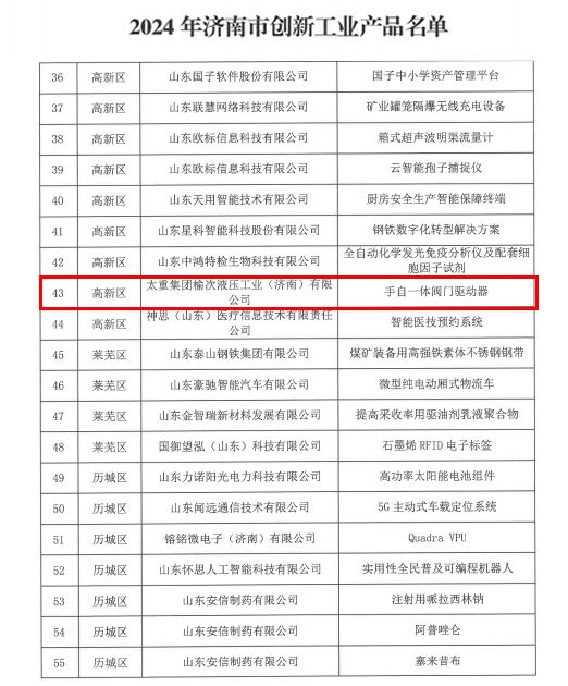 首次參評收獲豐!近日,濟南市工業(yè)和信息化局公布了2024年濟南市創(chuàng)新工業(yè)產(chǎn)品名單,太重榆液自主研發(fā)的“手自一體閥門驅(qū)動器”成功入選,以實際行動為太重品牌增亮添色!