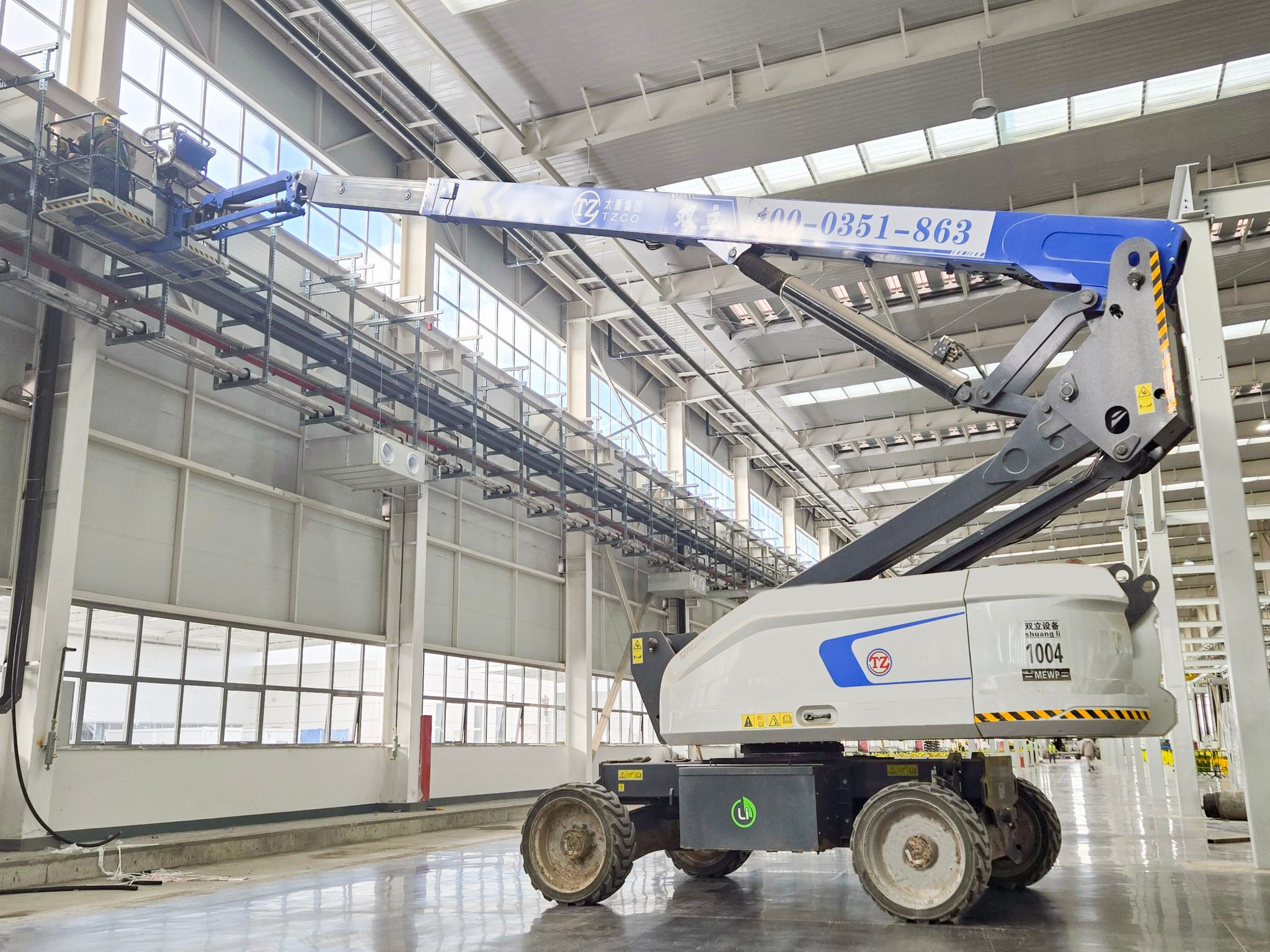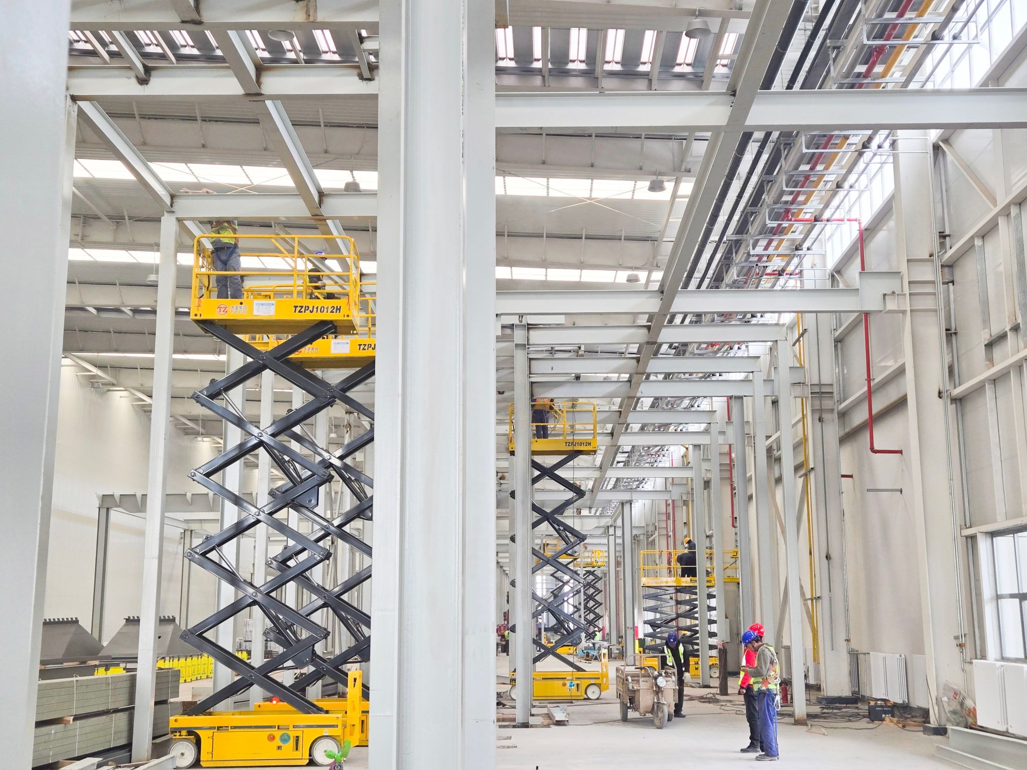 高端產(chǎn)線亮點(diǎn)紛呈,太重裝備在其中忙得“不亦樂乎”。聯(lián)合廠房內(nèi),太重研制的高空作業(yè)平臺(tái)隨處可見,隨車起重機(jī)更是以其靈活的特性在廠房完善中發(fā)揮著關(guān)鍵作用。一位現(xiàn)場施工人員感慨道:“太重直臂車、剪叉車成為我們的得力幫手,用自己的一流產(chǎn)品,造自己的一流園區(qū),相信園區(qū)建成之后,太重工程起重機(jī)產(chǎn)品的性能只會(huì)更好!”