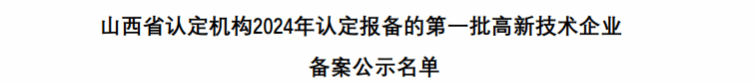 近日,全國(guó)高新技術(shù)企業(yè)認(rèn)定管理工作領(lǐng)導(dǎo)小組辦公室,正式發(fā)布《對(duì)山西省認(rèn)定機(jī)構(gòu)2024年認(rèn)定報(bào)備的第一批高新技術(shù)企業(yè)進(jìn)行備案的公告》。