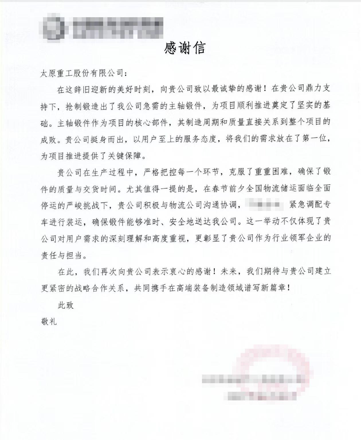 在這場緊急交付的“戰(zhàn)役”中,全體職工齊心協(xié)力、眾志成城,為用戶提供了最優(yōu)質(zhì)的產(chǎn)品及全方位的服務(wù),有力踐行了“用戶至上”的核心價值觀。這封感謝信,是太重一諾千金的見證,是用戶信任與支持太重品牌的最好詮釋。未來,公司將持續(xù)奮進(jìn),不斷提升服務(wù)質(zhì)量,深入踐行服務(wù)創(chuàng)新,以極致服務(wù)贏得用戶信賴,與合作伙伴攜手共進(jìn)、互利共贏,共同書寫合作發(fā)展的新篇章。