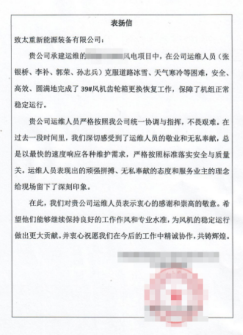 這封感謝信,映照出太重運維團隊堅韌付出的熾熱畫面?!叭蝿?wù)就是命令,保證供電需求,一刻耽誤不得。”運維團隊負責(zé)人張銀橋的話語擲地有聲,道出了團隊在極端環(huán)境下的堅守與擔(dān)當(dāng)。“堅守”是運維人員在-20℃的天氣中,為了排查風(fēng)機故障隱患,輪流值守在各個關(guān)鍵點位。“敬業(yè)”是運維人員在100米高空懸吊作業(yè)7小時后,用凍僵的手指完成0.02毫米齒輪間隙校準(zhǔn)。“協(xié)作”是運維人員面對突發(fā)故障,力出一孔,協(xié)同調(diào)配物資,迅速制定方案,大家緊密配合,高效協(xié)作,僅5天完成維護工作。一封感謝信,是認可,更是激勵。作為山西風(fēng)電裝備產(chǎn)業(yè)鏈“鏈主”企業(yè),太重在風(fēng)電領(lǐng)域有著強大的實力和優(yōu)勢。未來,公司將持續(xù)提升服務(wù)質(zhì)量、創(chuàng)新服務(wù)模式,以優(yōu)質(zhì)服務(wù)全力打造高品質(zhì)標(biāo)桿項目,與合作伙伴攜手前行,為推動新能源產(chǎn)業(yè)高質(zhì)量發(fā)展貢獻力量。