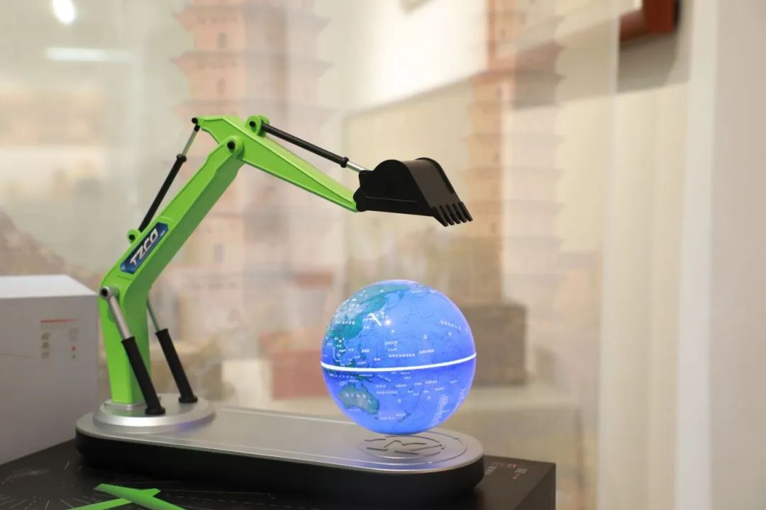 以明星產(chǎn)品氫能源挖掘機(jī)為原型,使用磁懸浮先進(jìn)技術(shù),托起空中的蔚藍(lán)星球。重型機(jī)械的磅礴力量在此升華為桌面空間的科技美學(xué),生動訴說著太重“掘勝全球”的壯志——以智能化與綠色化駛向全球大市場!