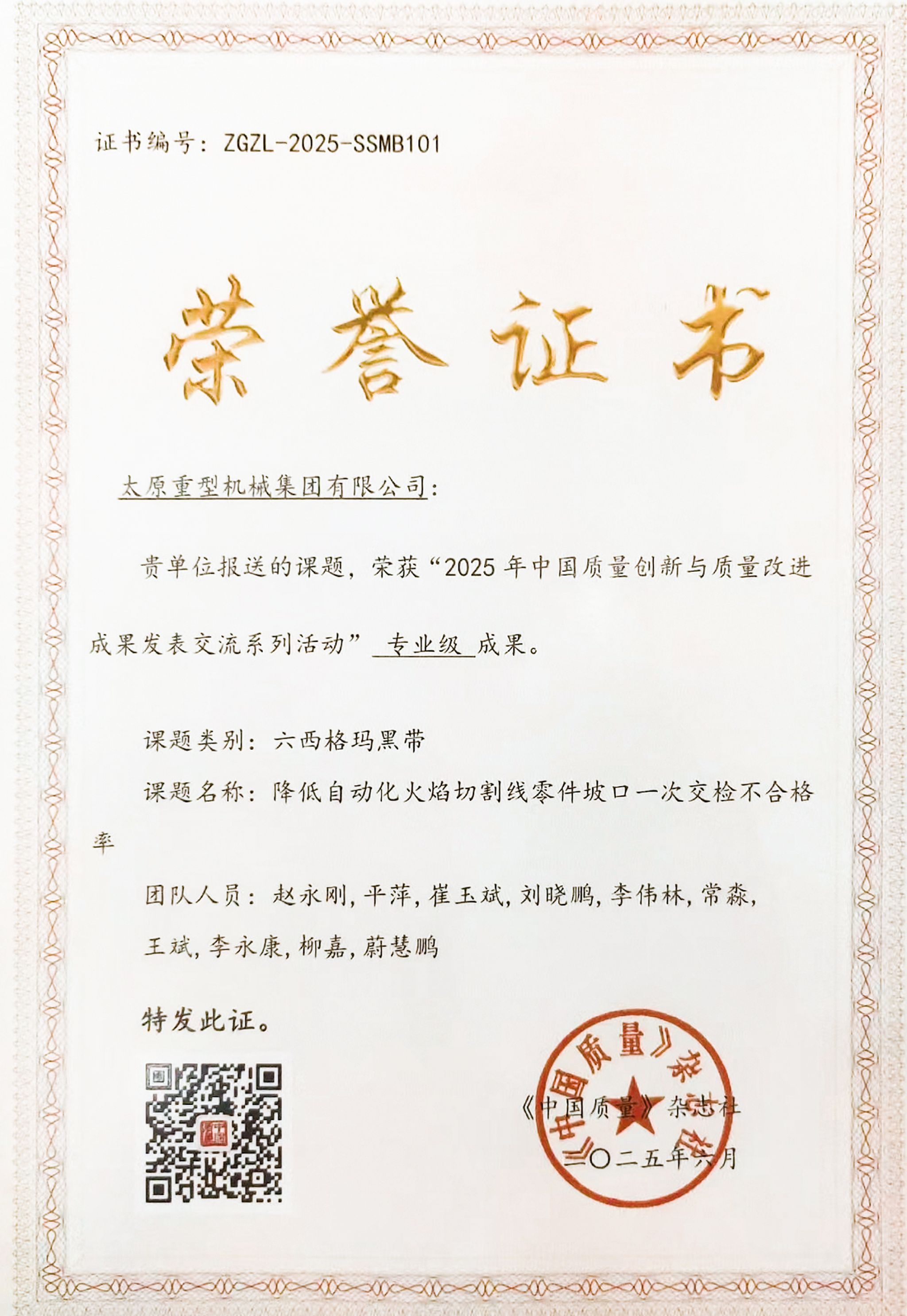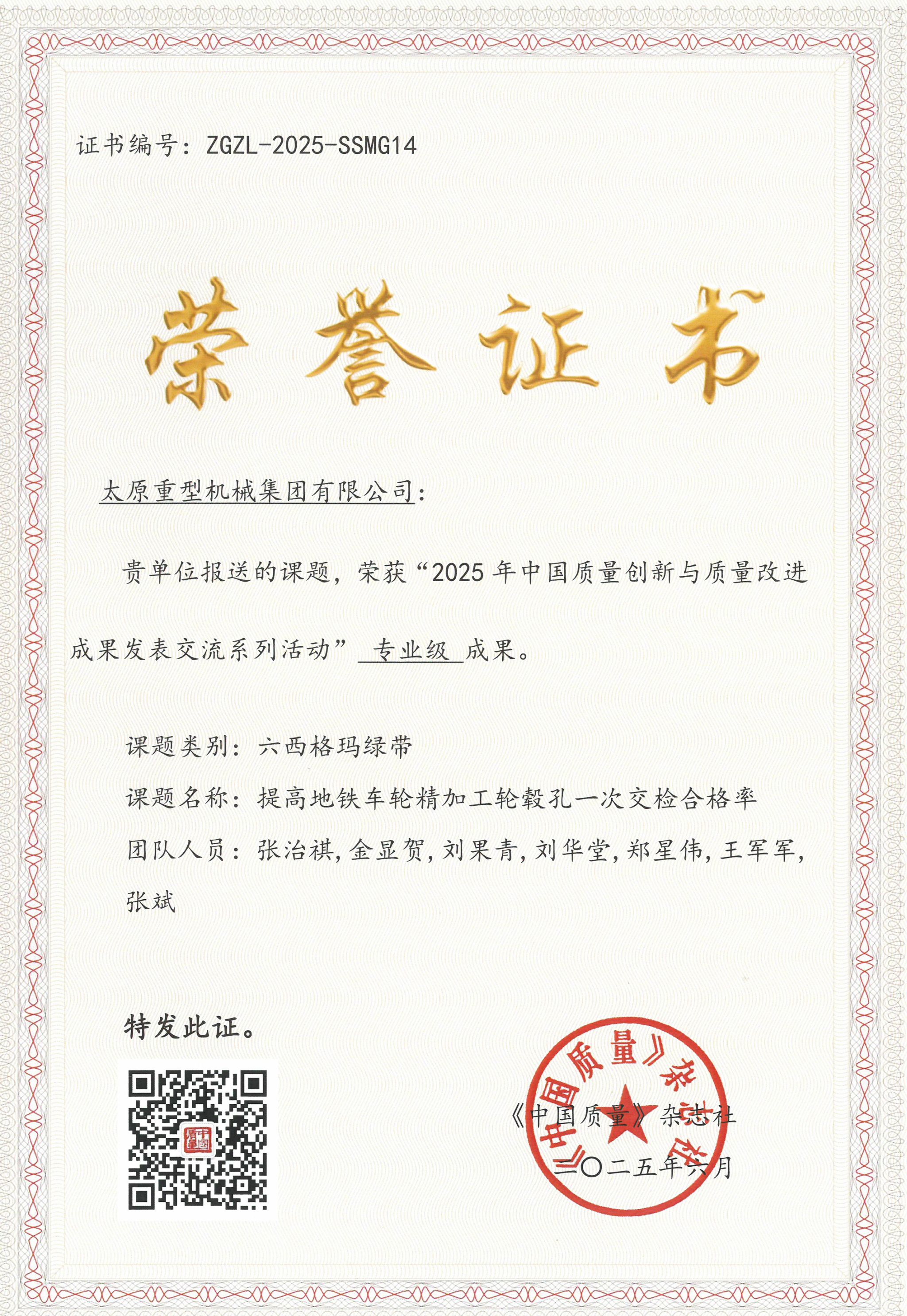 這份成績源自持續(xù)的質(zhì)量管理投入。在中國質(zhì)量協(xié)會《中國質(zhì)量》雜志社組織的“2025年中國質(zhì)量創(chuàng)新與質(zhì)量改進成果發(fā)表交流系列活動”中,太重報送的6項六西格瑪成果憑借突出的技術(shù)創(chuàng)新性和實際效益脫穎而出,成功斬獲“示范級”“專業(yè)級”成果獎項,這也是太重連續(xù)第二年在該權(quán)威活動中榮獲獎項。