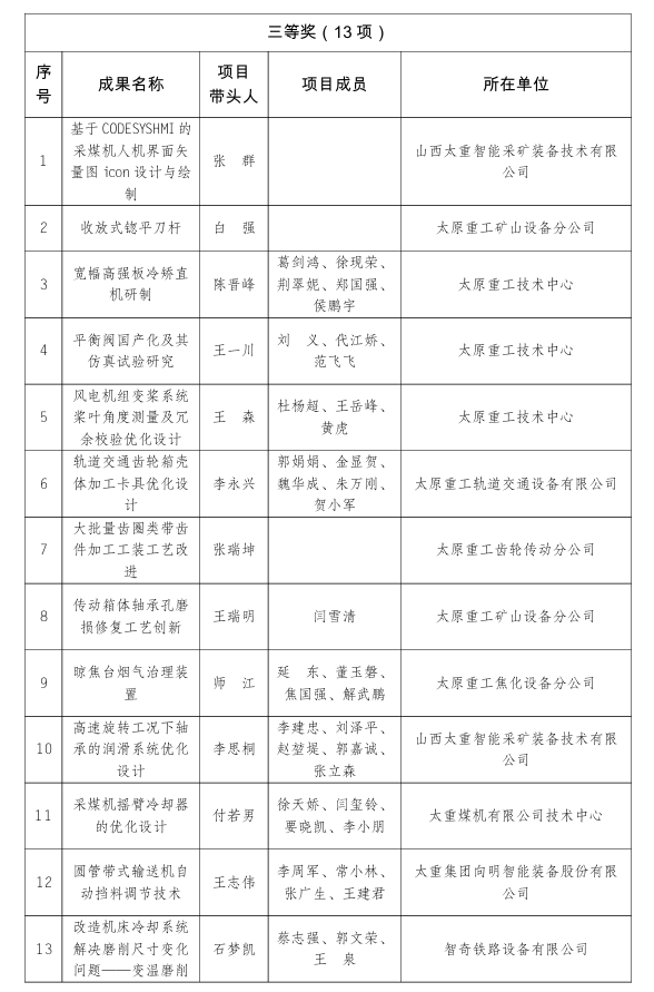 近日,2025年全省“五小”創(chuàng)新大賽及2025年全市“五小”創(chuàng)新大賽獲獎(jiǎng)名單相繼揭曉,集團(tuán)公司申報(bào)的優(yōu)秀成果取得了可喜成績(jī)。其中,榮獲山西省二等獎(jiǎng)8項(xiàng)、三等獎(jiǎng)12項(xiàng);榮獲太原市一等獎(jiǎng)4項(xiàng)、二等獎(jiǎng)8項(xiàng)、三等獎(jiǎng)13項(xiàng)、優(yōu)秀獎(jiǎng)12項(xiàng)。太原重型機(jī)械集團(tuán)有限公司獲2025年全省“五小”創(chuàng)新大賽優(yōu)勝單位。太原重型機(jī)械集團(tuán)有限公司工會(huì)、太重煤機(jī)有限公司工會(huì)獲2025年全市“五小”創(chuàng)新大賽優(yōu)秀組織單位,太原重工起重機(jī)分公司、太原重工技術(shù)中心獲2025年全市“五小”創(chuàng)新大賽優(yōu)勝單位。一批技術(shù)創(chuàng)新 降本增效的獲獎(jiǎng)的創(chuàng)新成果有哪些吧~