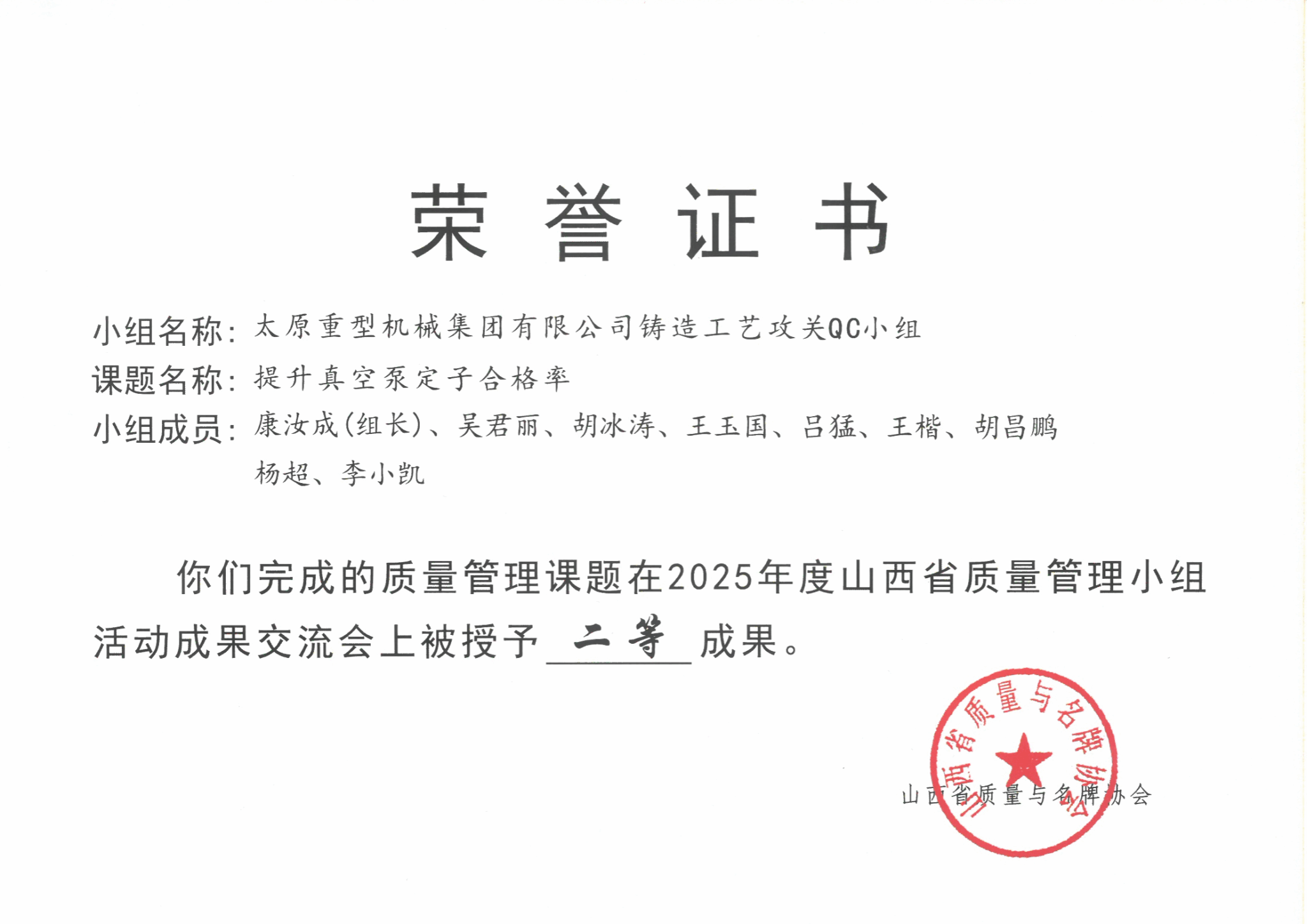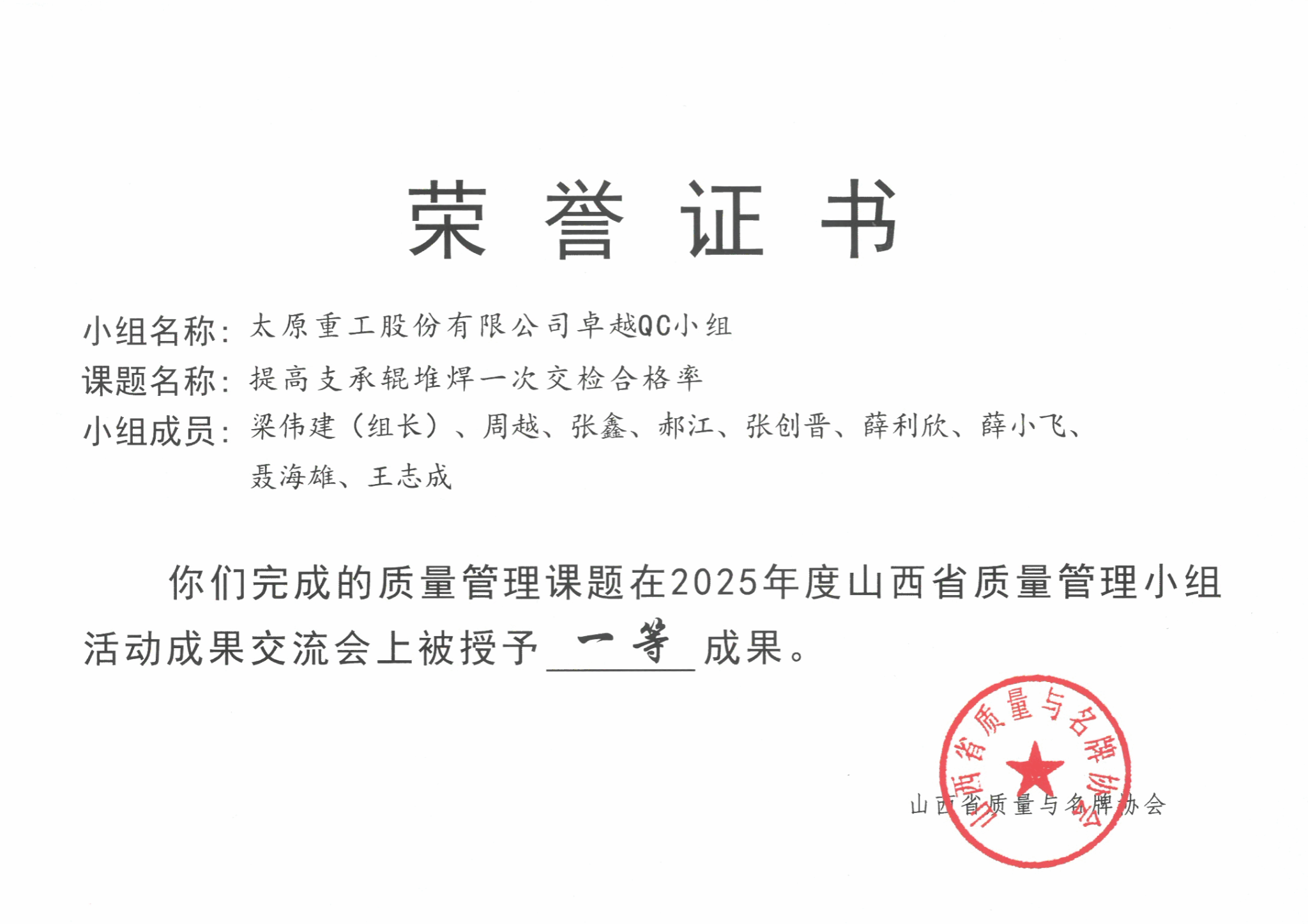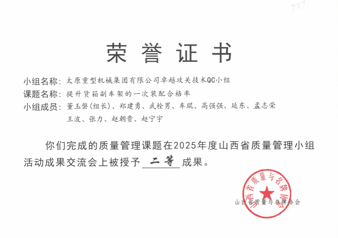 此外,還有太重榆液《提升真空泵定子合格率》、工程機(jī)械公司《降低中大挖動(dòng)臂焊后鉸接孔補(bǔ)孔率》、油膜分公司《襯套加工效率提升的裝置研制》、焦化公司《提升貨箱副車架的一次裝配合格率》四個(gè)項(xiàng)目榮獲全省二等成果。
