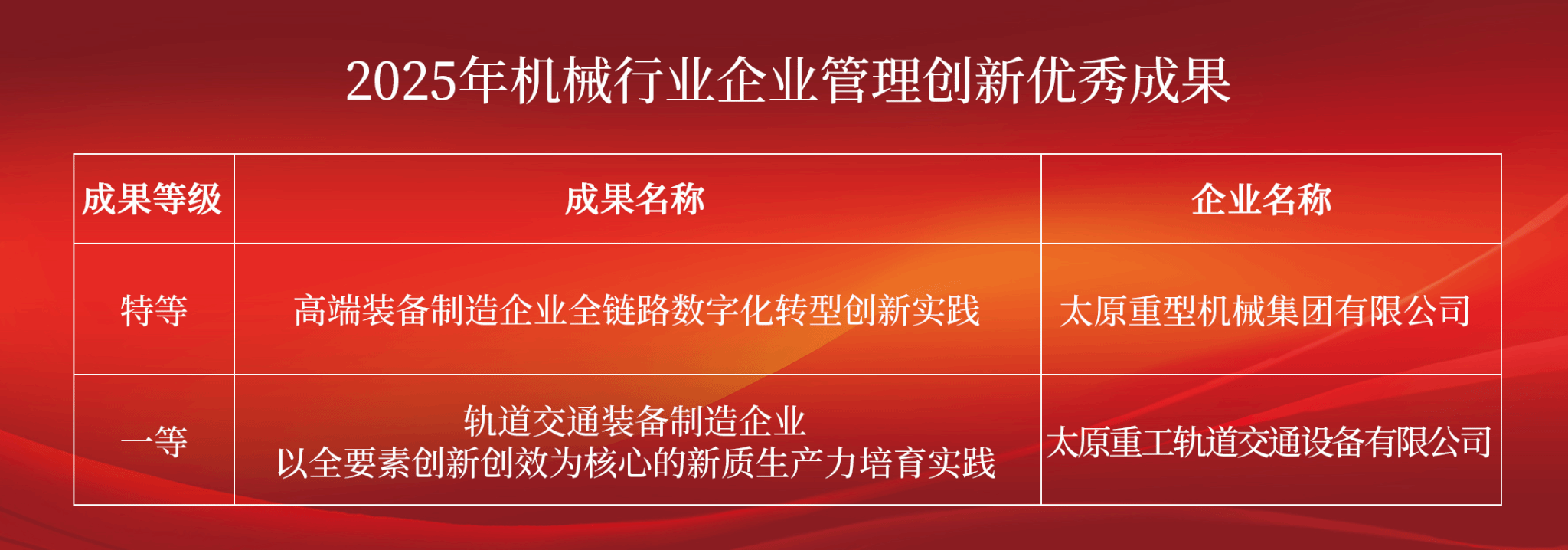 改革之路,創(chuàng)新筑基!近日,中國機械行業(yè)企業(yè)管理協(xié)會正式發(fā)布2025年機械行業(yè)企業(yè)管理創(chuàng)新優(yōu)秀成果名單,太重兩項成果榮耀上榜,分別獲得特等獎和一等獎。