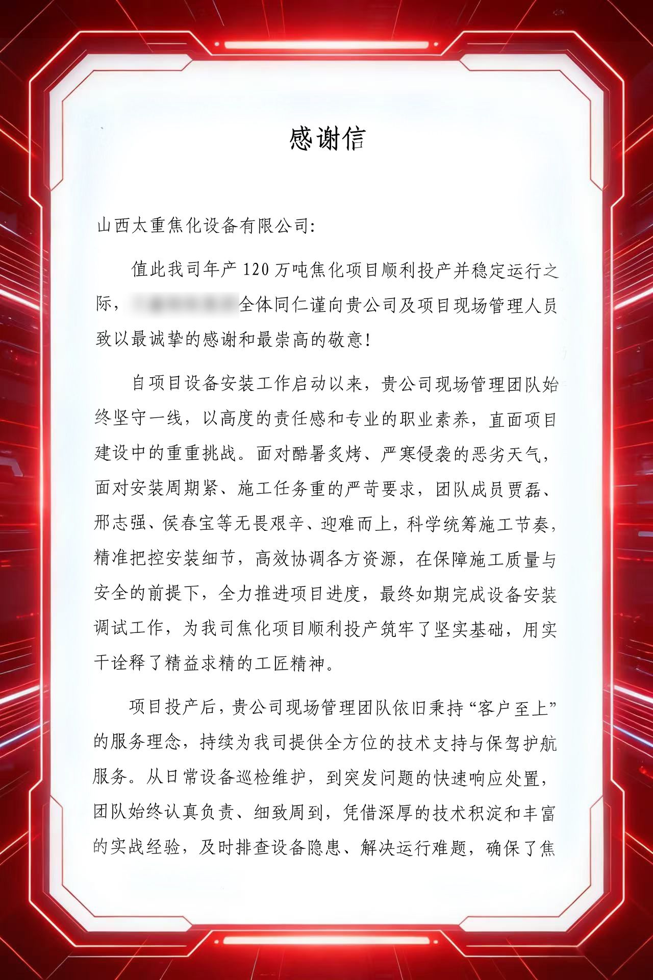 “過硬專業(yè)能力、頑強拼搏的工作作風和貼心細致的服務態(tài)度,讓我們深受感動?!苯眨炒笮弯撹F集團在發(fā)給太重的感謝信中,用這樣一段話,對太重焦化公司現(xiàn)場管理團隊在年產(chǎn)120萬噸焦化項目建設中的責任擔當給予高度評價。