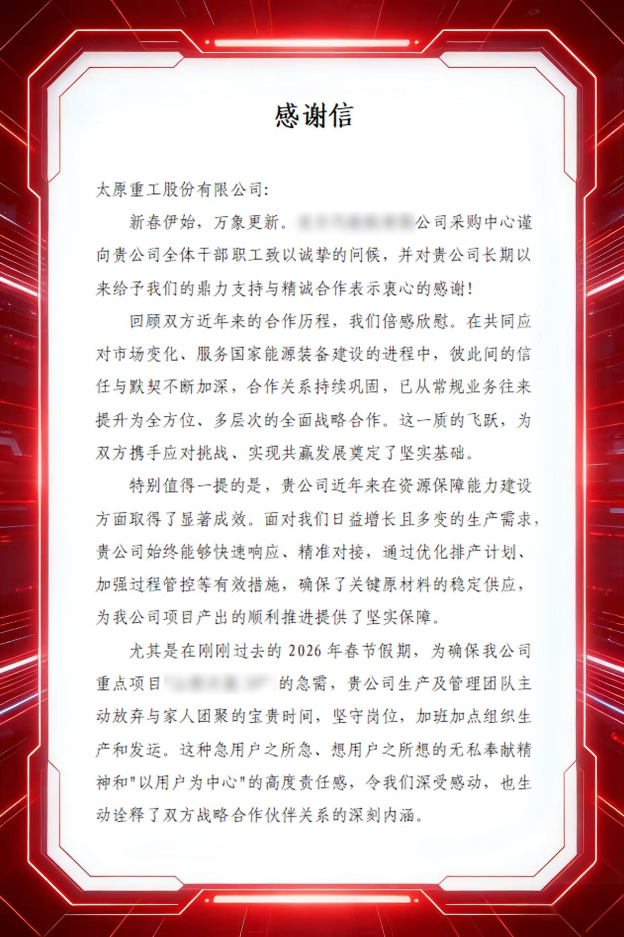 “貴公司始終能夠快速響應(yīng)、精準(zhǔn)對接,通過優(yōu)化排產(chǎn)計劃、加強過程管控等有效措施,確保了關(guān)鍵原材料的穩(wěn)定供應(yīng)?!?/span>