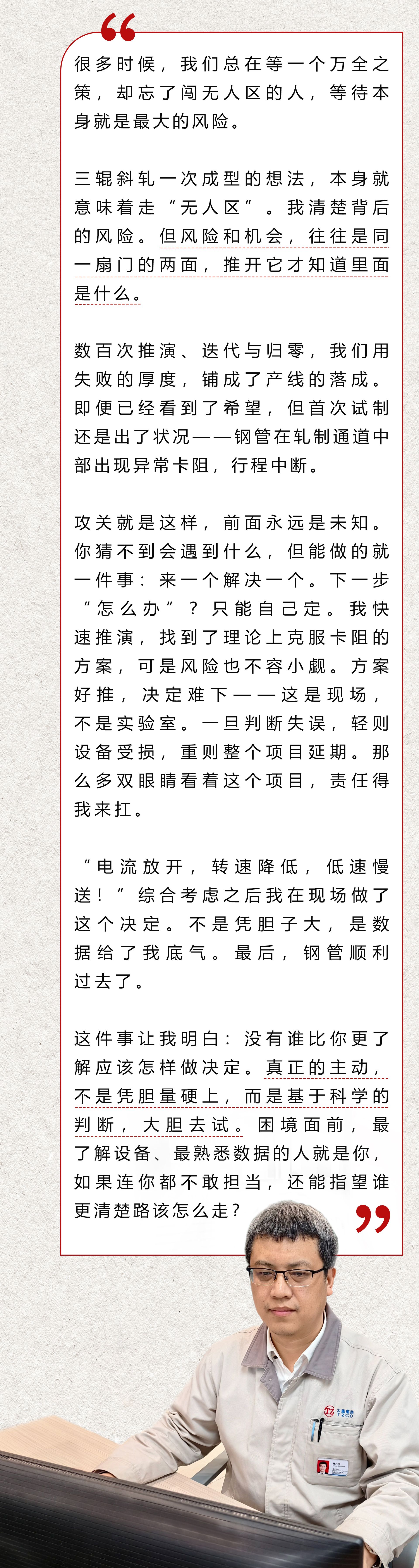當(dāng)?shù)谝桓鸺t的鋼管從全新的生產(chǎn)線上完美成型時(shí),技術(shù)中心軋鋼所的暢興剛沒有說話,只是看著那根鋼管從熾白漸變成暗紅,直到有人喊了一聲:“成了!”,他才回過神來,手里緊緊攥著的那張工藝參數(shù)表已經(jīng)皺皺巴巴。