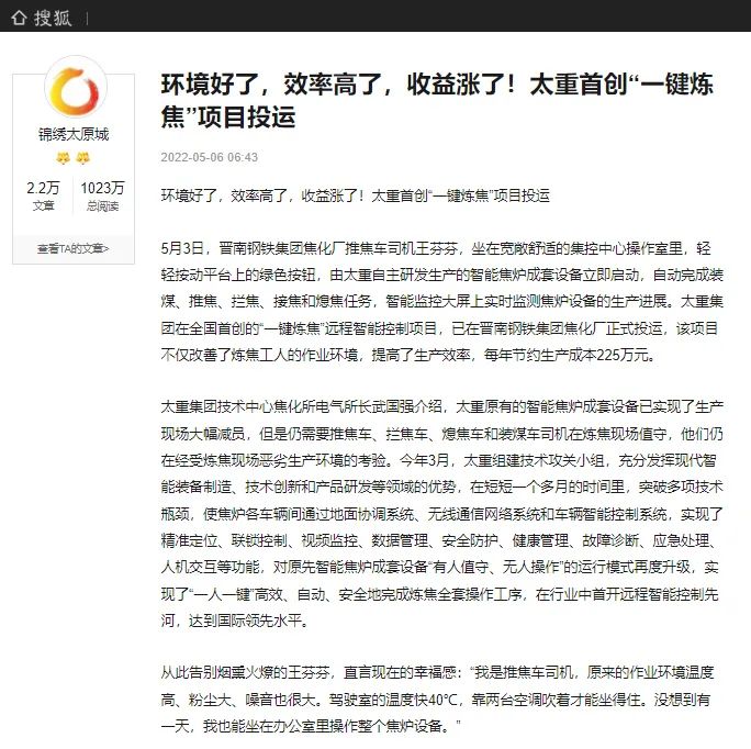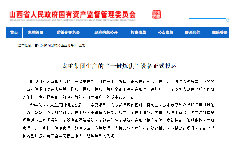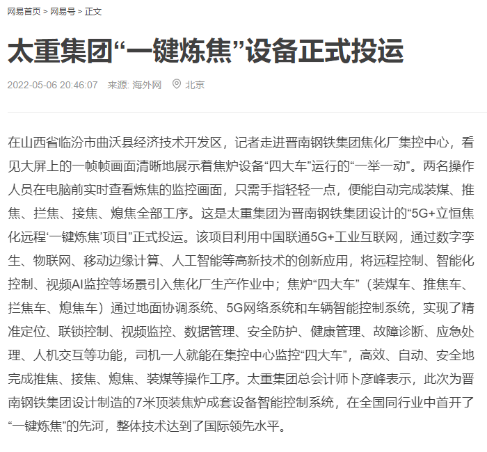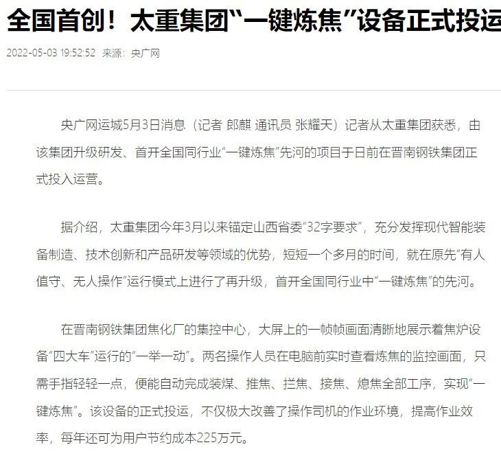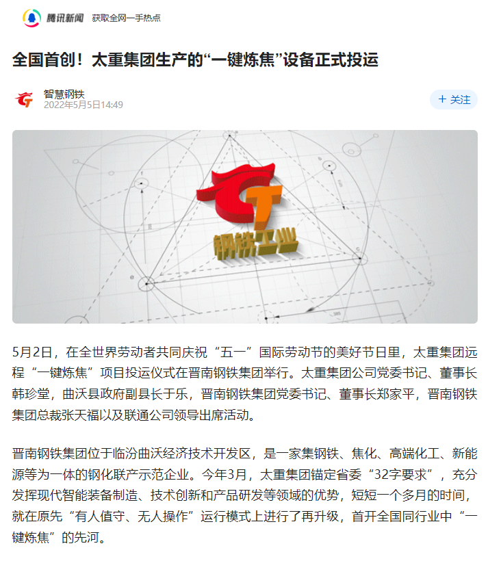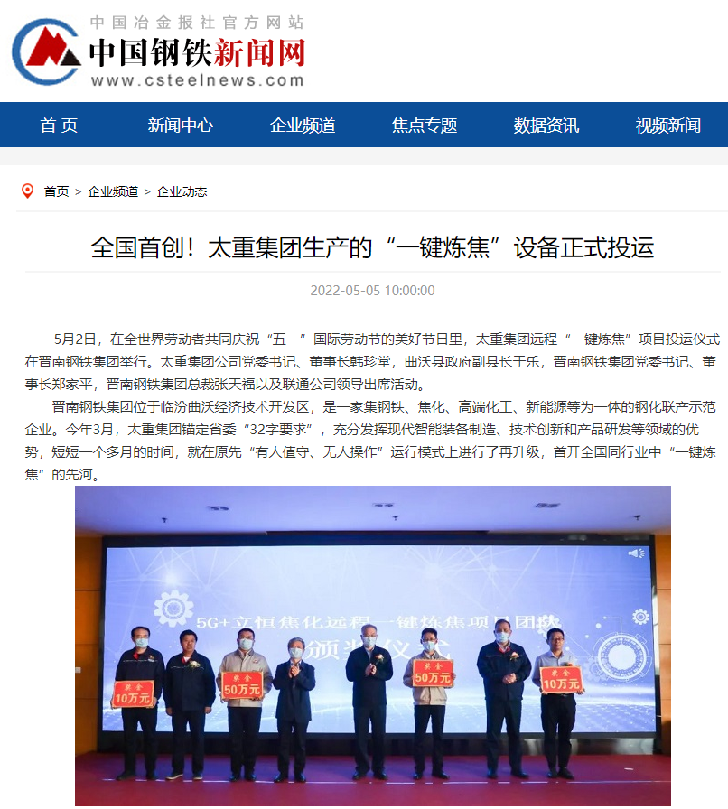 央廣網(wǎng)、中國(guó)鋼鐵新聞網(wǎng)、騰訊以《全國(guó)首創(chuàng)!太重集團(tuán)“一鍵煉焦”設(shè)備正式投運(yùn)》為題,聚焦太重集團(tuán)以科技創(chuàng)新激發(fā)“智造”新活力為出發(fā)點(diǎn),全面展示“智能+5G”在“一鍵煉焦”上的應(yīng)用,助力焦化領(lǐng)域效能提升、節(jié)能降耗和轉(zhuǎn)型升級(jí)。中國(guó)經(jīng)濟(jì)網(wǎng)、網(wǎng)易、山西國(guó)資以《太重集團(tuán)“一鍵煉焦”設(shè)備正式投運(yùn)》為題,報(bào)道太重集團(tuán)“一鍵煉焦”項(xiàng)目正式開(kāi)啟智能煉焦新時(shí)代,填補(bǔ)技術(shù)空白,開(kāi)創(chuàng)國(guó)內(nèi)焦化行業(yè)先河。搜狐網(wǎng)以《環(huán)境好了,效率高了,收益漲了!太重首創(chuàng)“一鍵煉焦”項(xiàng)目投運(yùn)》為題,重點(diǎn)展示了太重集團(tuán)“一鍵煉焦”項(xiàng)目成果,實(shí)現(xiàn)智能綠色工廠轉(zhuǎn)型再升級(jí)。山西日?qǐng)?bào)、山西晚報(bào)、太原日?qǐng)?bào)分別以《首開(kāi)全國(guó)同行業(yè)先河!太重“一鍵煉焦”項(xiàng)目投入運(yùn)行》《太重大發(fā)明:動(dòng)動(dòng)手指“一鍵煉焦”》《太重首創(chuàng)“一鍵煉焦”項(xiàng)目投運(yùn)》為題,聚焦太重“智造”再提速,充分展現(xiàn)公司以“三性五化”為新產(chǎn)品開(kāi)發(fā)目標(biāo),助力國(guó)家實(shí)現(xiàn)“雙碳”目標(biāo)。