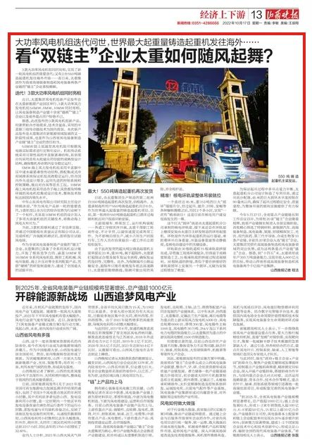 10月17日,山西晚報(bào)刊發(fā)《看“雙鏈主”企業(yè)太重如何隨風(fēng)起舞?》文章,對太重集團(tuán)3款大功率風(fēng)電機(jī)組、550噸鑄造起重機(jī)、核電環(huán)軌梁進(jìn)行報(bào)道。太重集團(tuán)作為我省唯一一家“雙鏈主”企業(yè),深耕智能高端裝備制造和風(fēng)電裝備領(lǐng)域,實(shí)施一系列提質(zhì)、增效、擴(kuò)量的升級改造項(xiàng)目,實(shí)現(xiàn)“設(shè)計(jì)研發(fā)、智能控制、三電總成、整體集成”的發(fā)展格局,集聚產(chǎn)業(yè)鏈優(yōu)勢資源,強(qiáng)化上下游產(chǎn)業(yè)協(xié)同,勇?lián)版溨鳌逼髽I(yè)責(zé)任,推動(dòng)我省制造業(yè)高質(zhì)量發(fā)展,為轉(zhuǎn)型發(fā)展蹚新路持續(xù)注入強(qiáng)勁動(dòng)能。