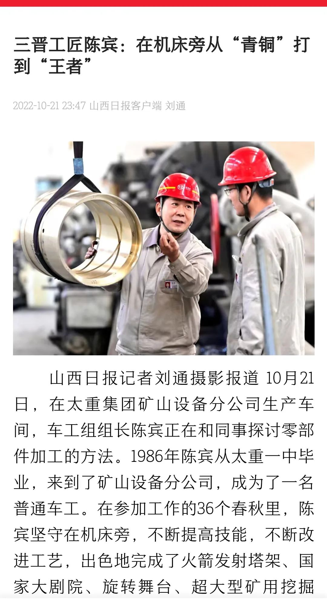 10月21日,山西日?qǐng)?bào)以《三晉工匠陳賓:在機(jī)床旁從“青銅”打到“王者”》為題,對(duì)太重職工陳賓進(jìn)行了報(bào)道。陳賓36年來潛心鉆研、不斷創(chuàng)新、精益求精,致力于大型關(guān)鍵零件的精加工任務(wù),成為一名名副其實(shí)的“三晉工匠”。