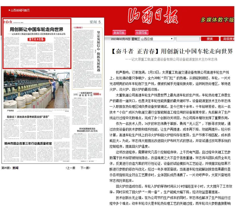 今天的《山西日報》對太重軌道交通公司設(shè)備能源室技術(shù)主辦宋志偉帶領(lǐng)創(chuàng)新團隊,在太重高質(zhì)量高速度發(fā)展進程中,以永不懈怠的奮進姿態(tài)做出突出貢獻的生動事跡進行了聚焦報道。