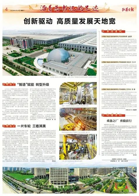 6月24日,山西日?qǐng)?bào)頭版及四版整版多篇報(bào)道紛紛聚焦太重集團(tuán),深入報(bào)道了在習(xí)近平總書記考察調(diào)研太重六年間的巨大變化。太重集團(tuán)在高質(zhì)量發(fā)展的道路上蹄疾步穩(wěn),用實(shí)際行動(dòng)回應(yīng)著領(lǐng)袖的殷殷囑托。作為省內(nèi)唯一“雙鏈主”企業(yè),太重不斷加大科研投入力度,在突破關(guān)鍵核心技術(shù)、促進(jìn)產(chǎn)業(yè)轉(zhuǎn)型升級(jí)的最前沿業(yè)績突出,蔚然形成千帆奮競、全面創(chuàng)新的生動(dòng)局面,受到了主流媒體的關(guān)注。