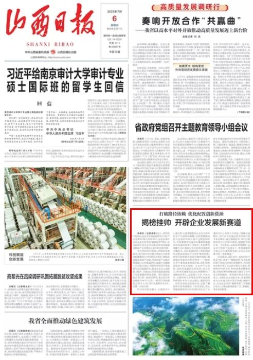 今天,山西日?qǐng)?bào)頭版刊發(fā)《揭榜掛帥 開(kāi)辟企業(yè)發(fā)展新賽道》文章,聚焦太重結(jié)合技術(shù)需求,通過(guò)“揭榜掛帥”項(xiàng)目,與高校、科研院所科研方向、科研成果精準(zhǔn)對(duì)接,堅(jiān)持以科技創(chuàng)新賦能高質(zhì)量發(fā)展,不斷完善技術(shù)研發(fā)體系,力爭(zhēng)在山西省轉(zhuǎn)型發(fā)展中更好發(fā)揮龍頭帶動(dòng)作用。