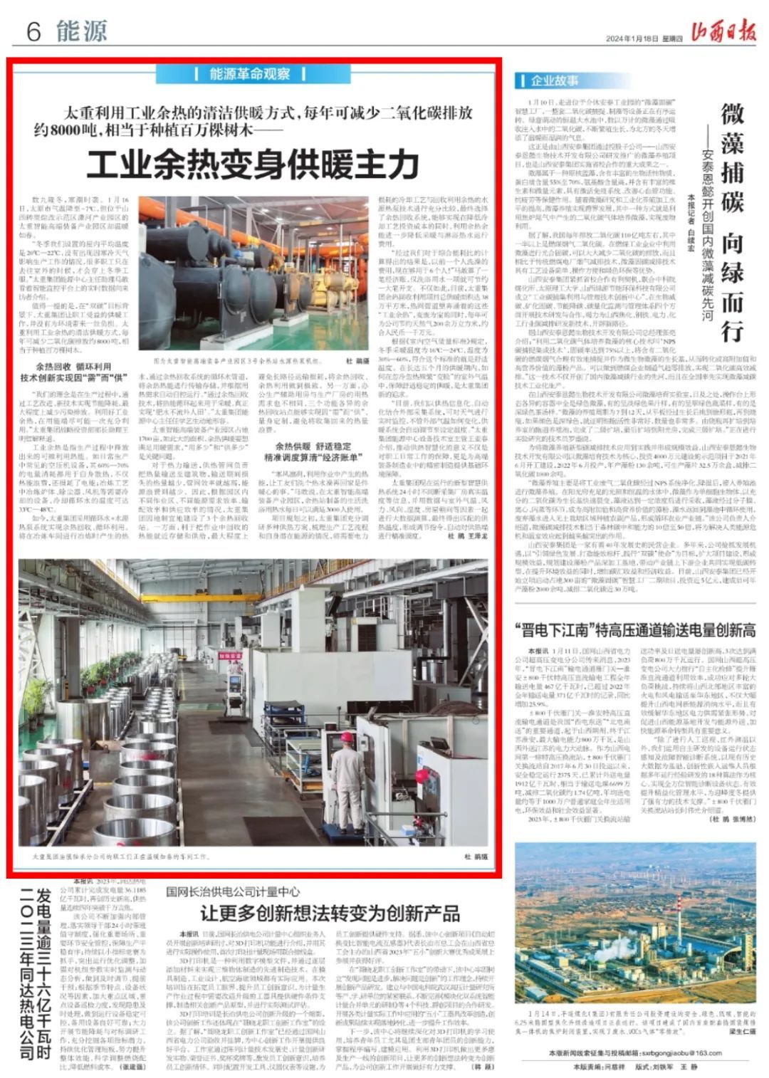 今日,山西日?qǐng)?bào)《能源革命觀察》專欄,對(duì)太重集團(tuán)聚焦國(guó)家“雙碳”目標(biāo),通過(guò)技術(shù)創(chuàng)新變廢為寶,將工業(yè)余熱變身供暖主力進(jìn)行了重點(diǎn)報(bào)道。一直以來(lái),太重集團(tuán)持續(xù)踐行“綠水青山就是金山銀山”理念,著力構(gòu)建綠色環(huán)保長(zhǎng)效工作機(jī)制,加快推動(dòng)公司綠色低碳轉(zhuǎn)型發(fā)展,為實(shí)現(xiàn)國(guó)家戰(zhàn)略貢獻(xiàn)太重力量、展現(xiàn)國(guó)企擔(dān)當(dāng)。