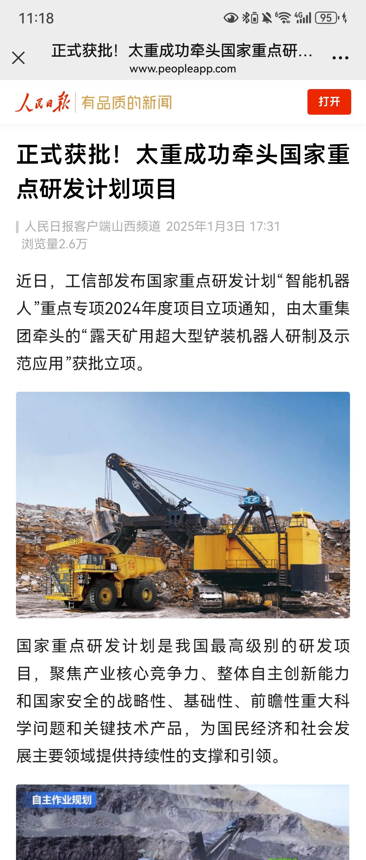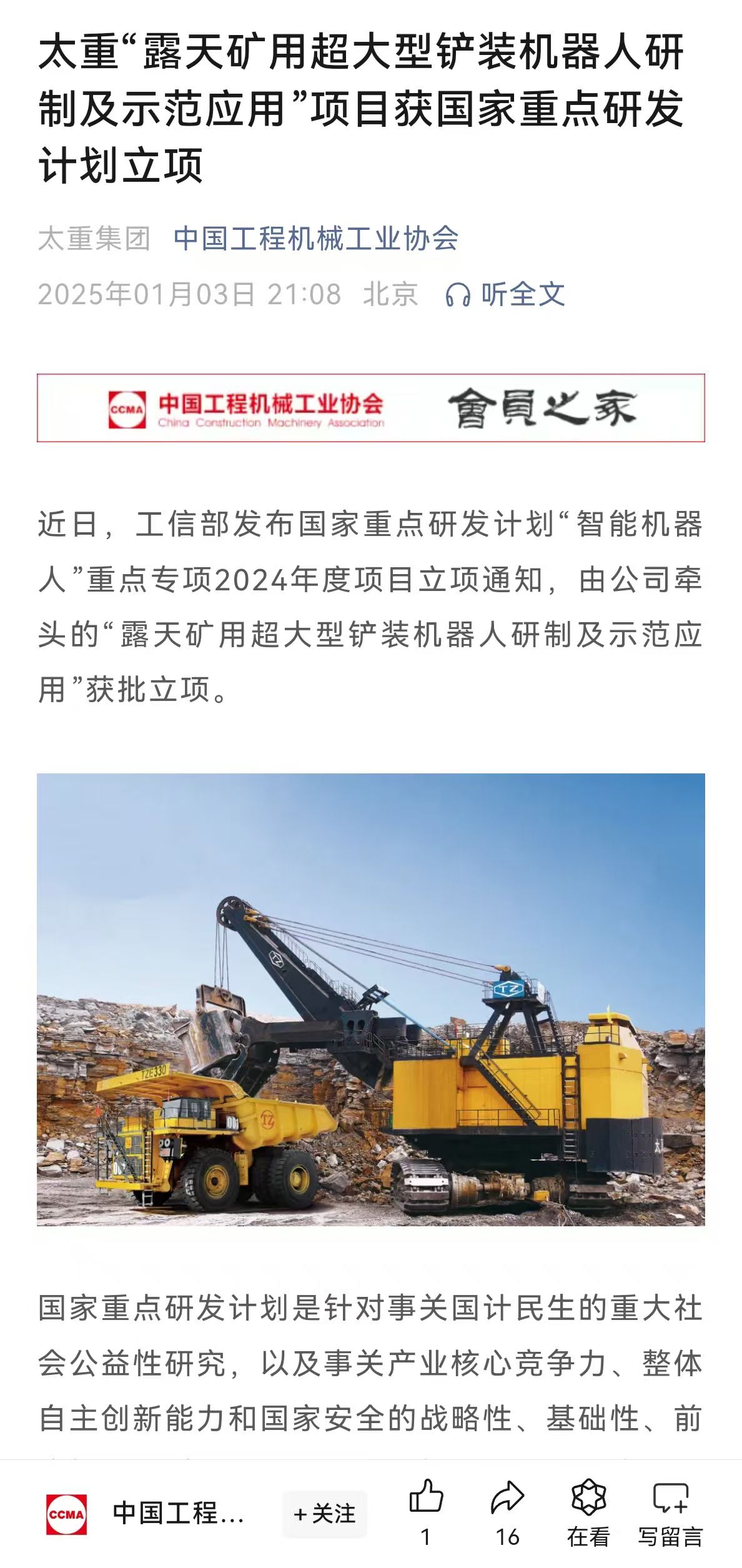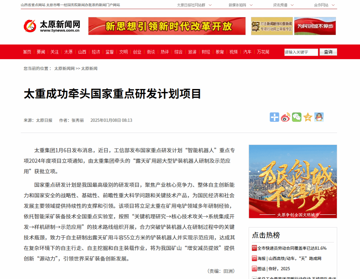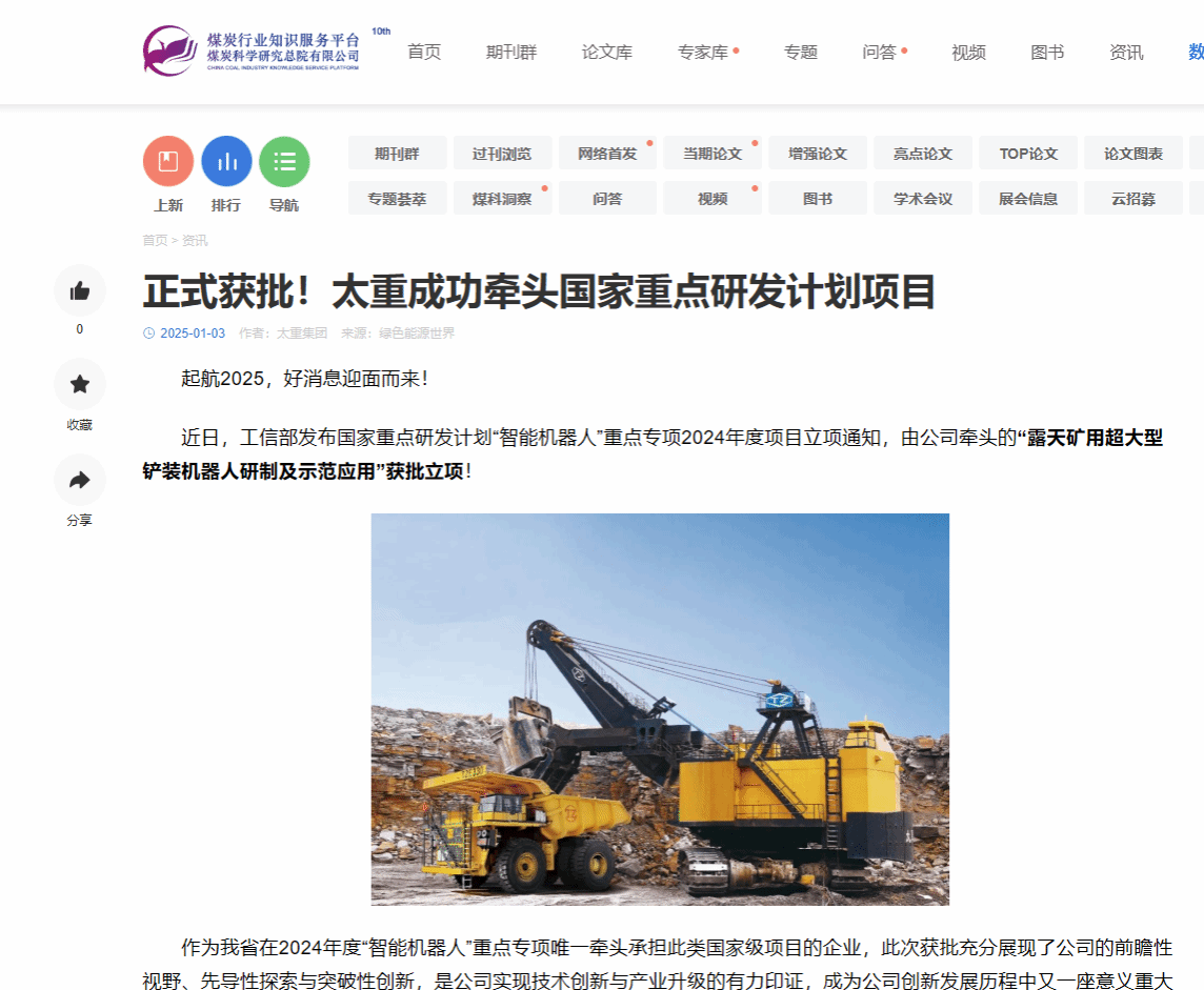 助力我國智慧礦山建設(shè),太重在行動!近日,2024年度國家重點研發(fā)計劃立項結(jié)果公布,公司牽頭的“露天礦用超大型鏟裝機器人研制及示范應(yīng)用”獲批立項!太重集團官微發(fā)布這一消息后,立刻受到人民日報的重磅關(guān)注,彰顯出國家對太重科技創(chuàng)新能力的高度認(rèn)可。與此同時,山西日報、太原日報、中國工程機械工業(yè)協(xié)會等主流媒體與行業(yè)平臺也迅速關(guān)注,紛紛轉(zhuǎn)發(fā)了太重這一重要突破,刷屏“朋友圈”!露天礦開采技術(shù)的全新智能化時代,在此啟航!