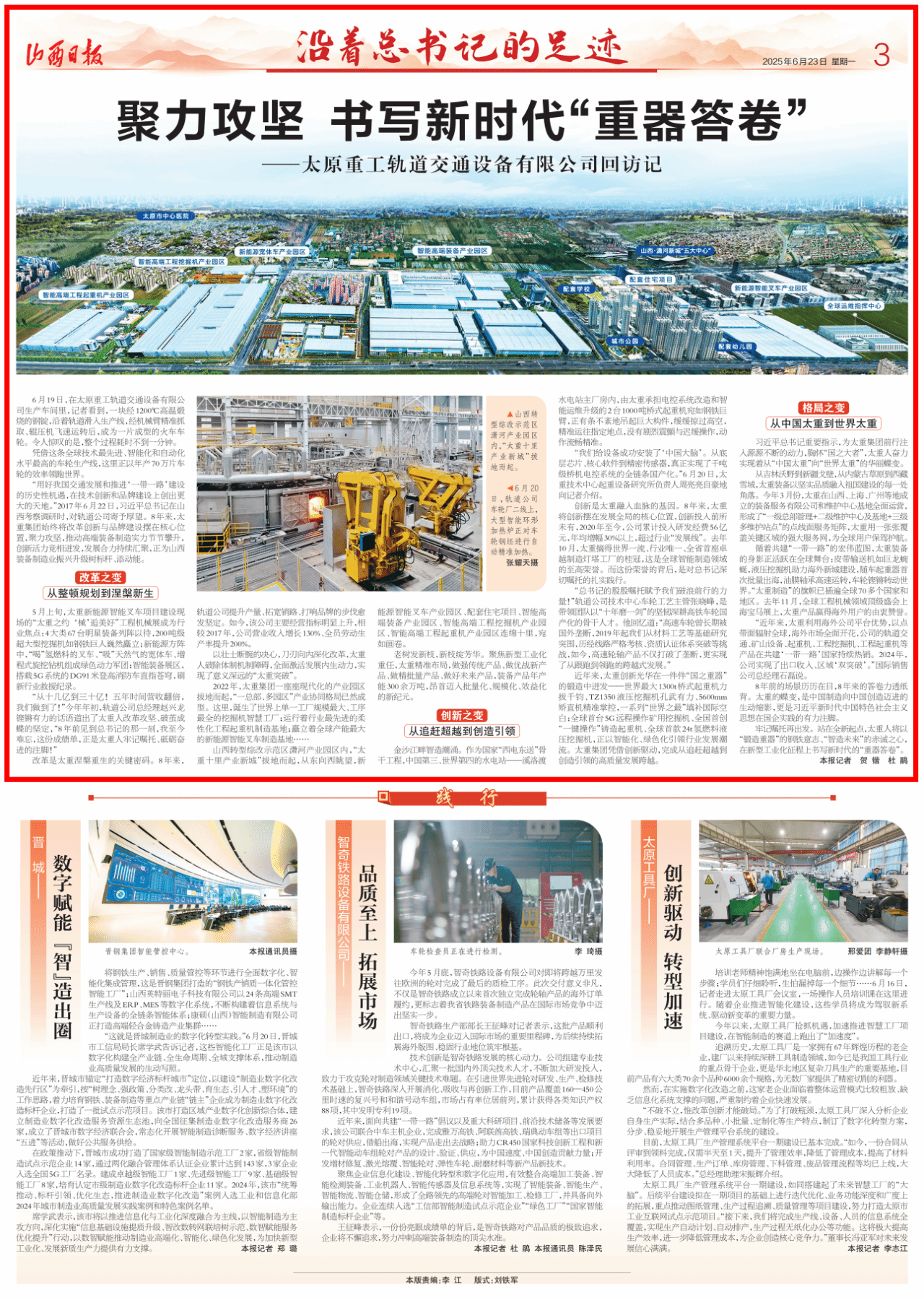 在習近平總書記考察調(diào)研太重八周年之際,山西新聞聯(lián)播、山西日報【沿著總書記的足跡】專欄聚焦太重,感知公司“智”造高地的澎湃動能,展現(xiàn)太重的改革之變、創(chuàng)新之變、格局之變,見證太重人加速競跑的具體實踐!