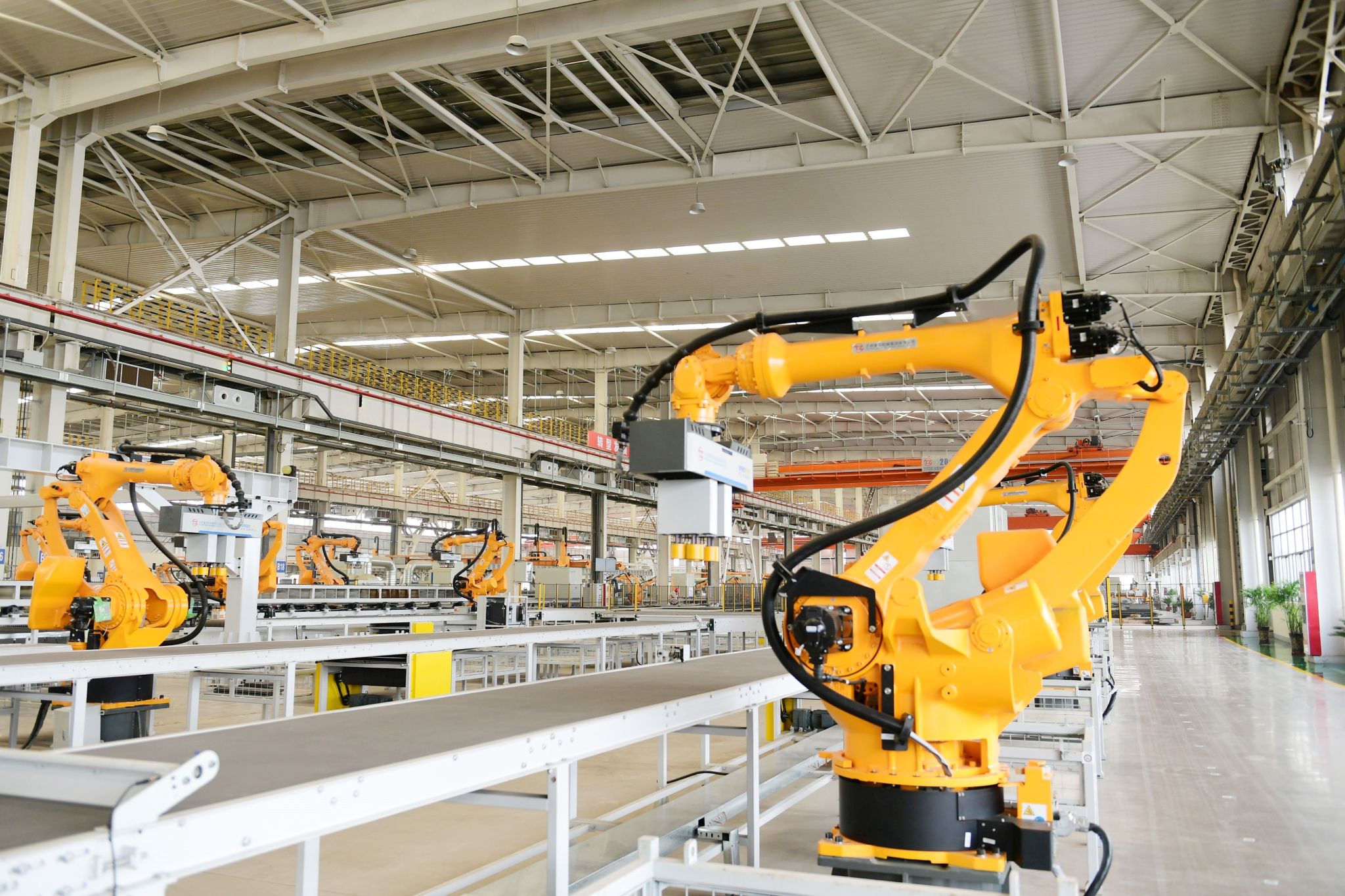 太重集團(tuán)智能高端裝備產(chǎn)業(yè)園區(qū)智能加工配送中心內(nèi),機(jī)器人在進(jìn)行全自動(dòng)分揀作業(yè)。