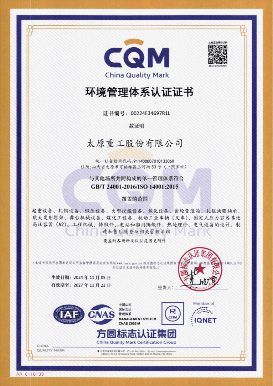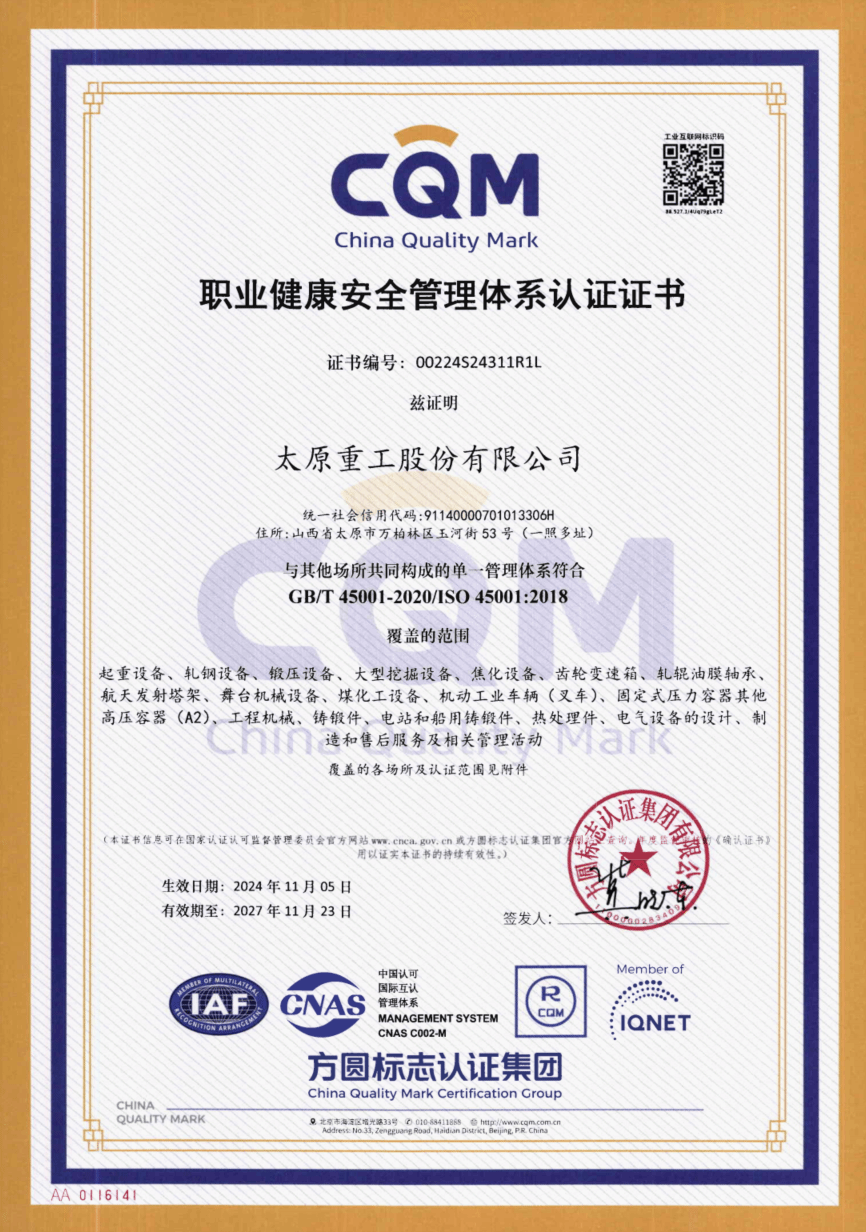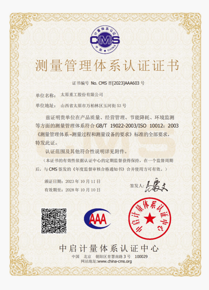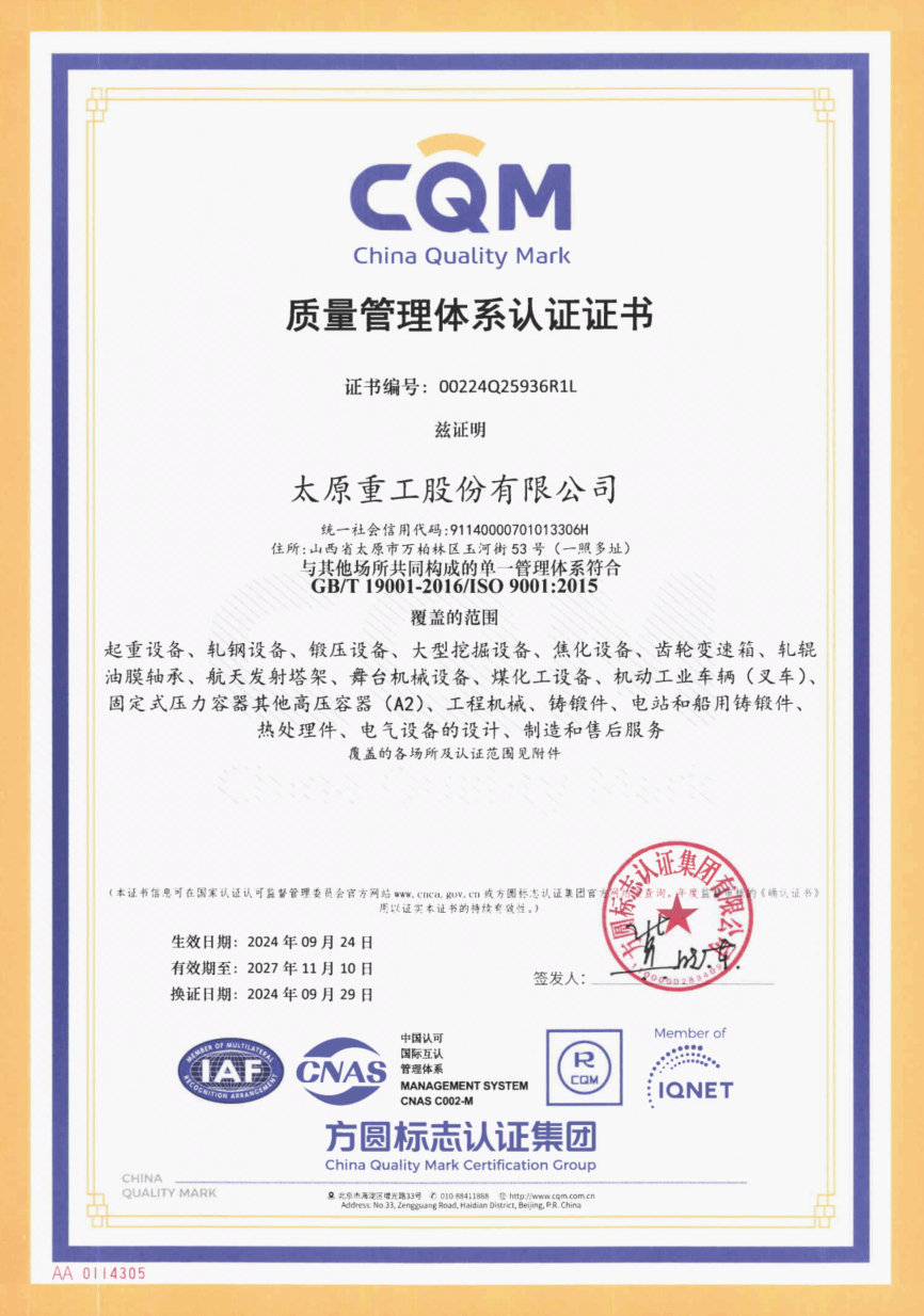 在執(zhí)行ISO9001標(biāo)準(zhǔn)的基礎(chǔ)上,太重積極推廣應(yīng)用可靠性管理、卓越績效管理等先進(jìn)管理方法、加強(qiáng)質(zhì)量激勵和質(zhì)量改進(jìn)力度,結(jié)合產(chǎn)品特點不斷建立健全個性化的質(zhì)量管理體系,通過實施“質(zhì)量管理體系認(rèn)證+可靠性管理體系認(rèn)證”,打造質(zhì)量管理體系升級版。太重榮獲了多項質(zhì)量管理榮譽(yù):